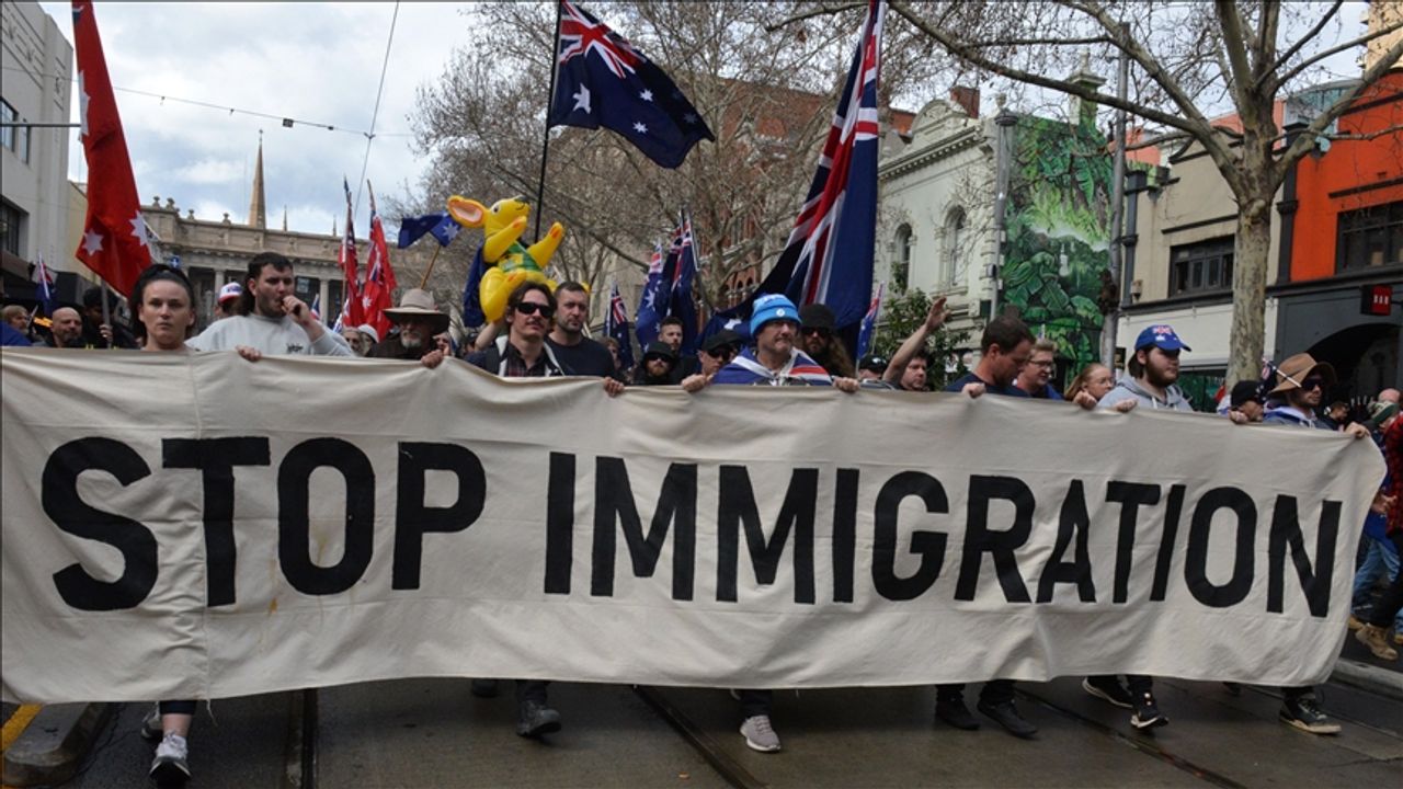 Melbourne'deki gösteride Avustralya bayrakları taşıyan gruplar, "Göçmen alımını durdurun", "Irkçı değilim, sadece herkesten nefret ediyorum" ve "Kitlesel göç ülkemizi yok ediyor" yazılı pankartlarla yürüdü.