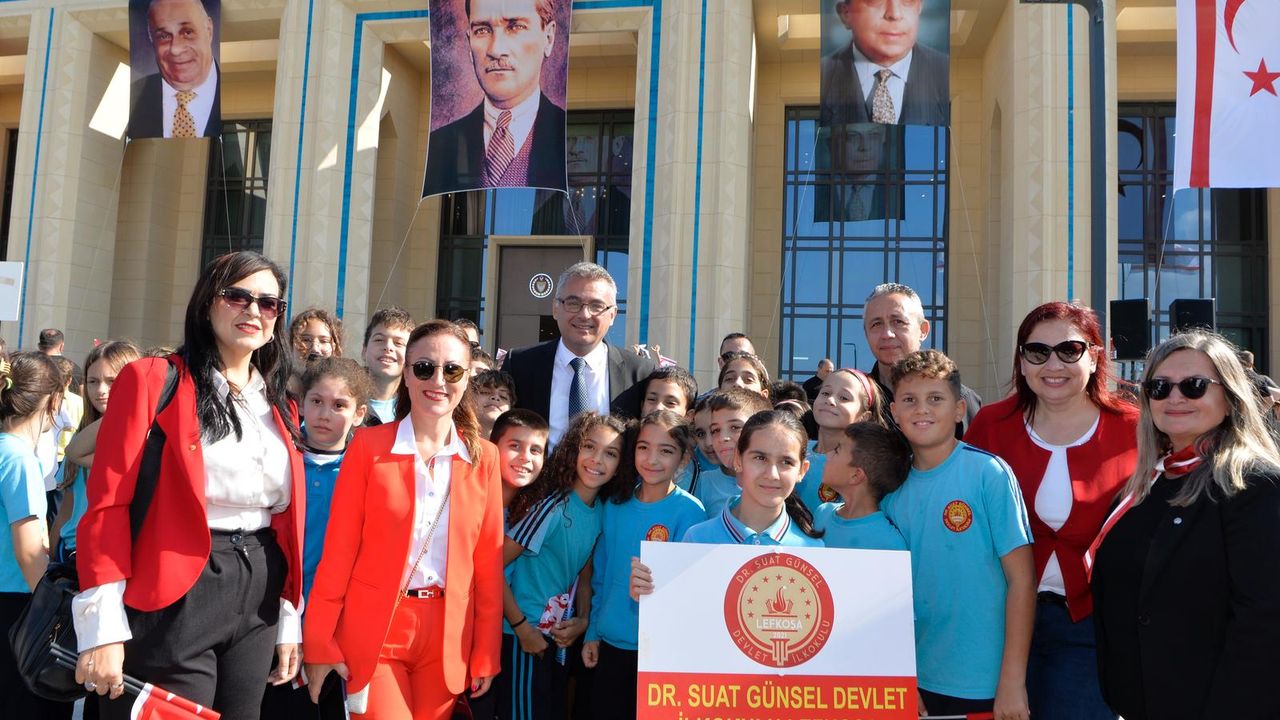 Ulu Önder Mustafa Kemal Atatürk, Kurucu Cumhurbaşkanı Rauf Raif Denktaş ve Kıbrıs Türk halkının varoluş ve özgürlük mücadelesi lideri Dr. Fazıl Küçük’ün yer aldığı bayrakları da taşıyan öğrencileri, Cumhurbaşkanı Tufan Erhürman selamladı.
