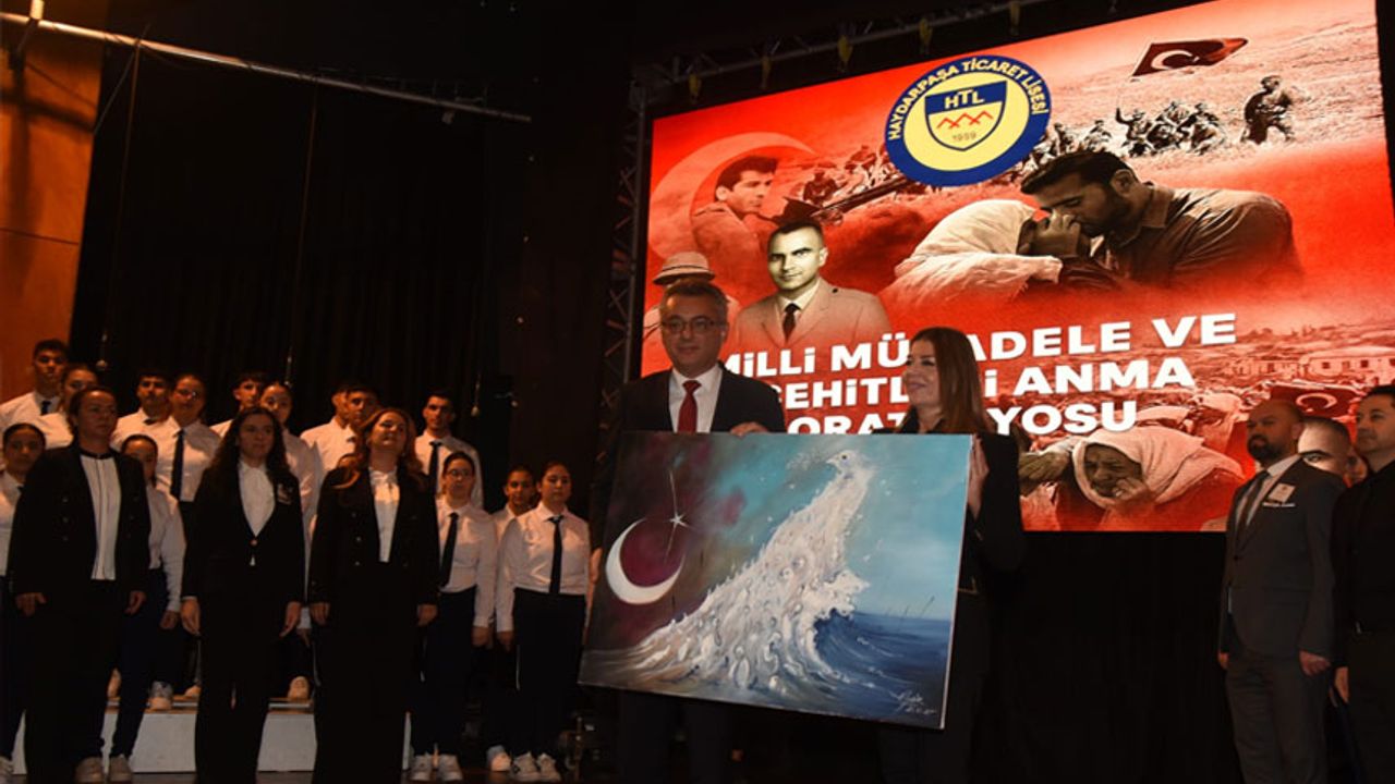 Haydarpaşa Ticaret Lisesi (HTL) tarafının Milli Mücadele ve Şehitleri Anma Oratoryosu’nun izlenmesinin ardından HTL Müdürü Meltem Adalı tarafından Cumhurbaşkanı Erhürman’a program sırasında Ressam Emir Ebru tarafından çizilen ve günün anlam ve önemini anlatan tablonun takdimi yapıldı.