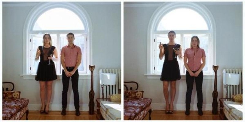 Çiftler önce sıradan bir fotoğraf çektiriyor ve ardından birbirlerinin kılıklarına girdikten sonra aynı yerde aynı şekilde bir kez daha kameraya poz veriyorlar.