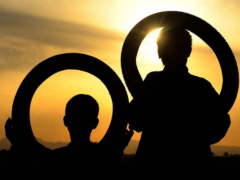 Afgan çocuklar ellerindeki lastiklerle kareye yansıyor. AFP