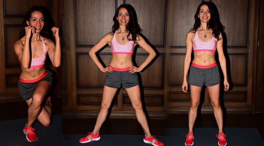1- Plie Squat: Ayak parmakları dışa dönük ve omuz genişliğinde açık, eller belde harekete başlıyoruz. Dizleri büküp, düzelterek kalkıyoruz. Kalçamız geride ya da ileride değil olduğu yere iniyor. Hareket, bacak grubunu özellikle iç kısımları daha aktif olacak şekilde çalıştırmaktadır. 3 set 15 er kez uyguluyoruz.