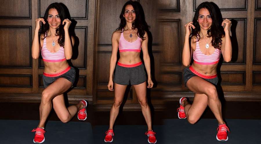 2- Curtsy Lunge: Ayaklar paralel, kalça genişliğinde açık bir ayağımızı diğer ayağın arkasına çapraz yerleştiriyoruz ve çöküp kalkıyoruz. Basen de dediğimiz kalçanın yanındaki gluteus medius ve minimus kaslarını devreye sokmak için harika bir egzersizdir. İki bacak için ayrı ayrı 3 set 15 kez tekrar uyguluyoruz.