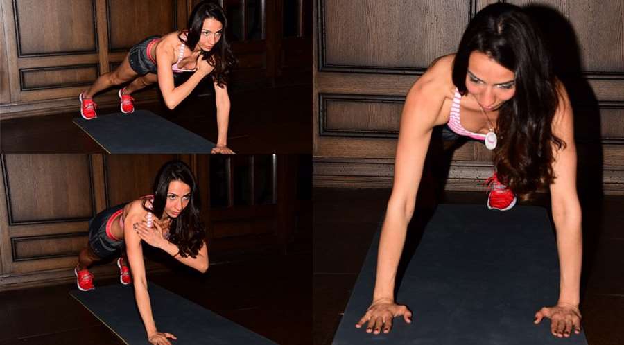 4- Plank with Shoulder Tap: Kalça, boyun ve bel boşluğu hizalı tek bir çizgi şeklinde yerleşerek plank yaparken tek tek çapraz omzumuza dokunuyoruz. Bu hareketle hem tüm vücut kaslarımız çalışıyor, hem de denge kazanarak karın kaslarımızı çalıştırıyoruz. 3 set 15 tekrar uygulanması tavsiye edilir.