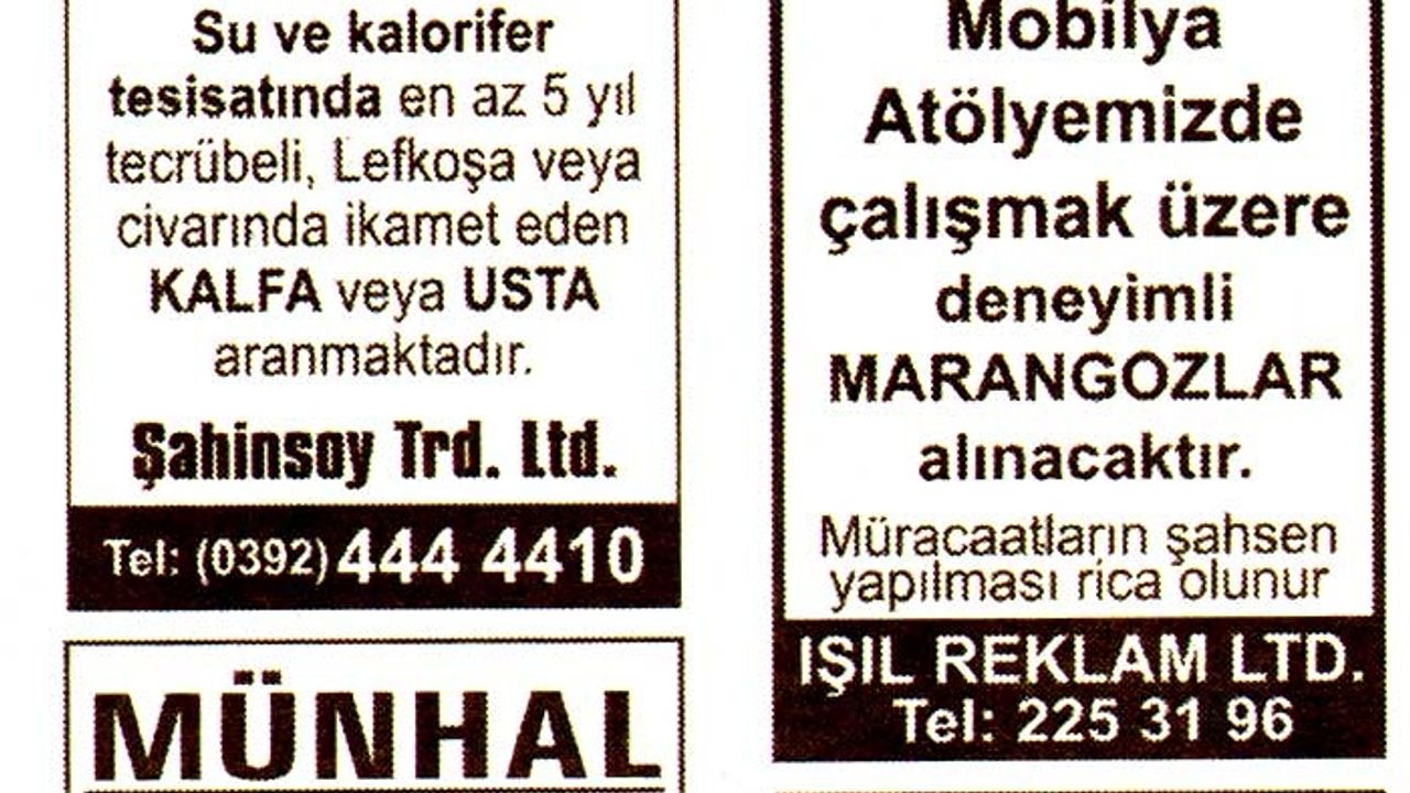 Kıbrıs Gazetelerinde yer alan iş ilanları. En üstte yer alan "Tam Ekran Yap" tuşuna basarsanız daha büyük halini görebilirsiniz.