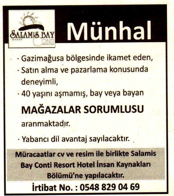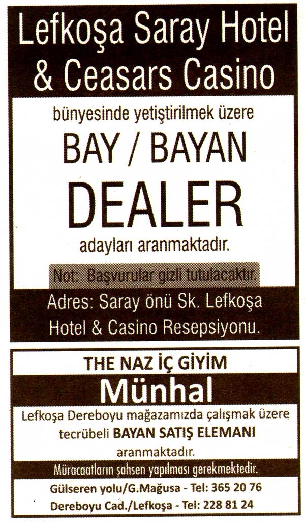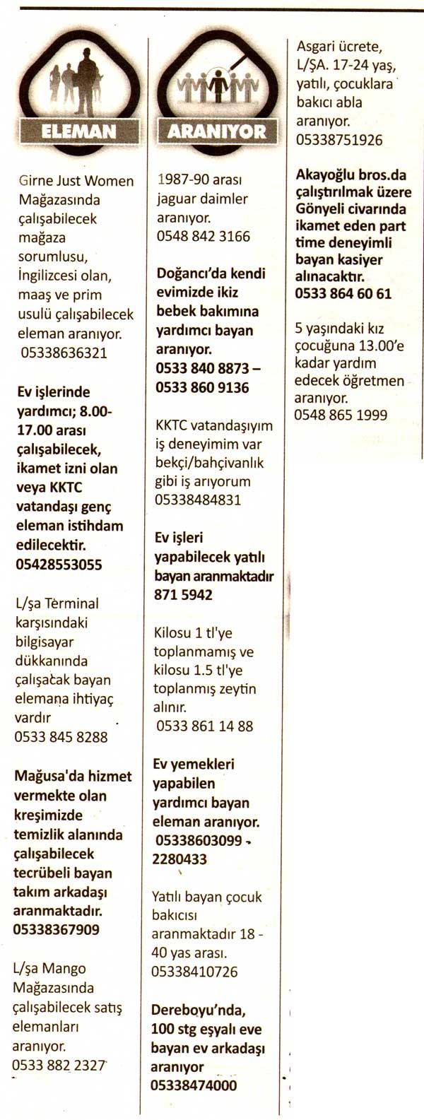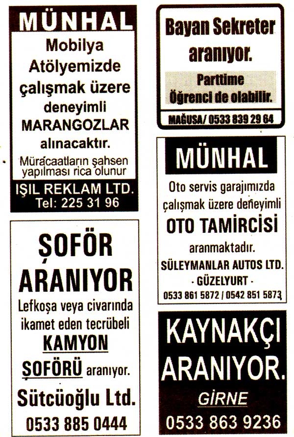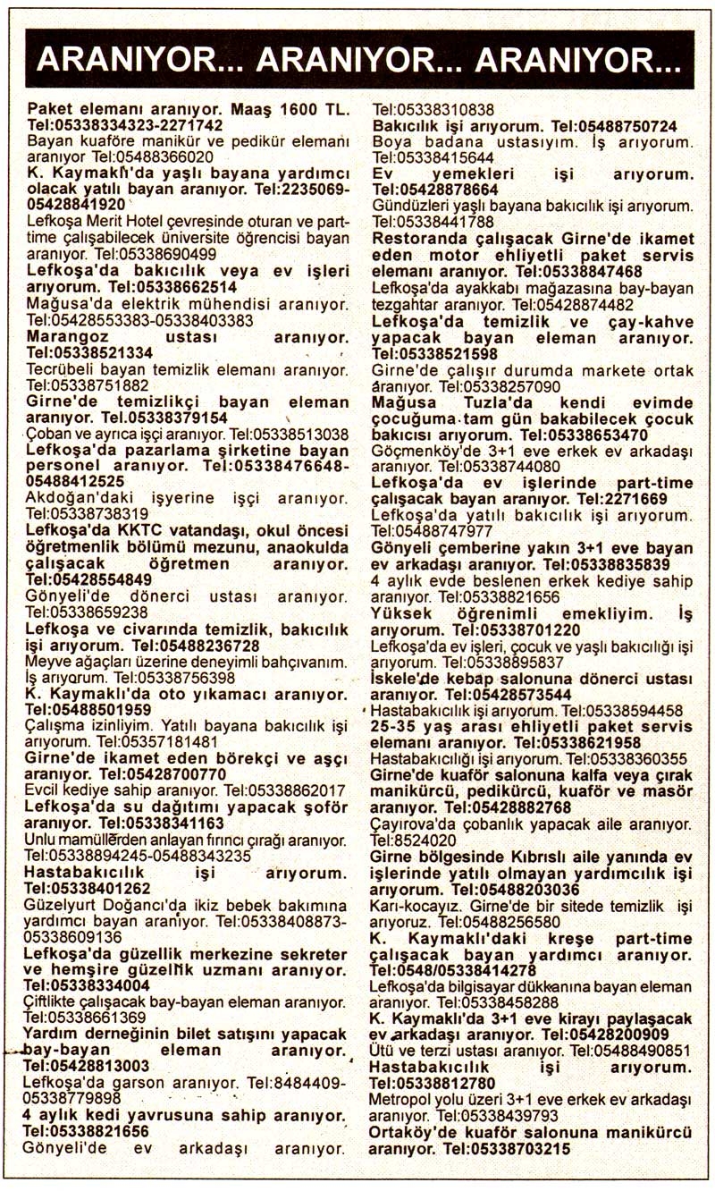 Kıbrıs Gazetelerinde yer alan iş ilanları. En üstte yer alan "Tam Ekran Yap" tuşuna basarsanız daha büyük halini görebilirsiniz.