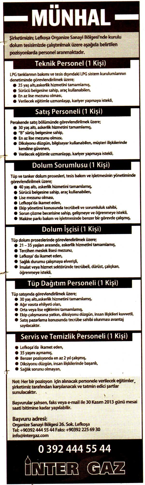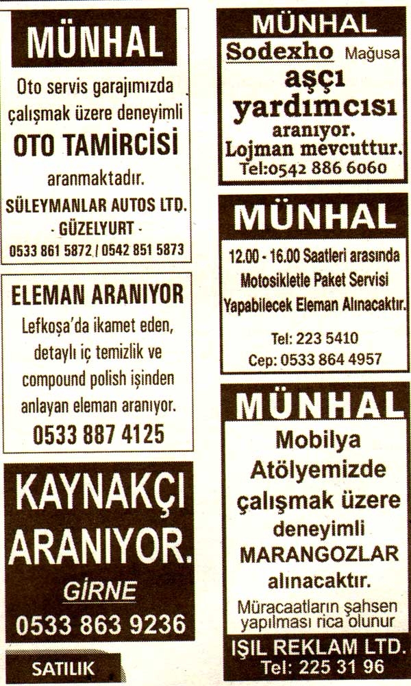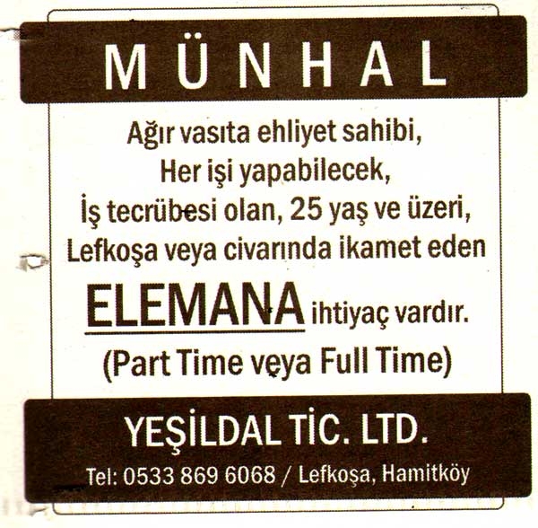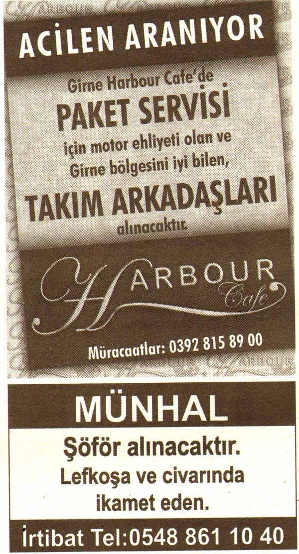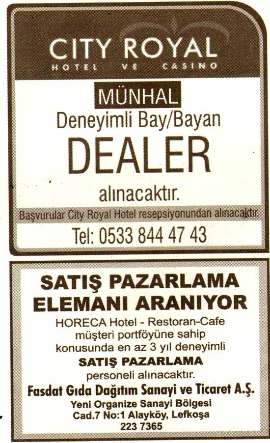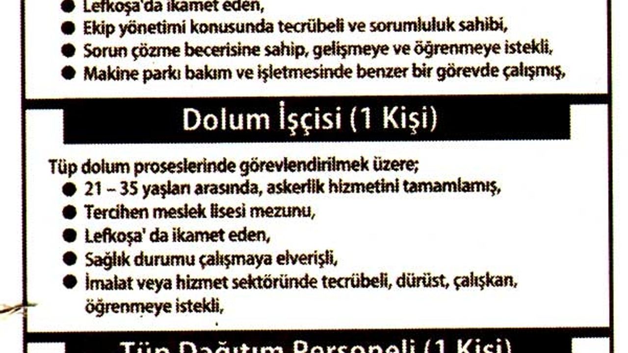 Kıbrıs Gazetelerinde yer alan iş ilanları. En üstte yer alan "Tam Ekran Yap" tuşuna basarsanız daha büyük halini görebilirsiniz.