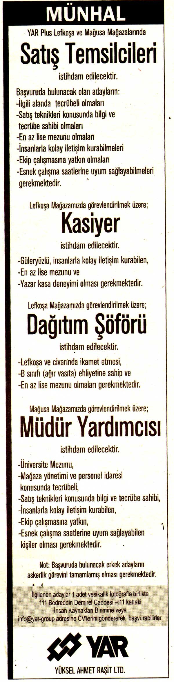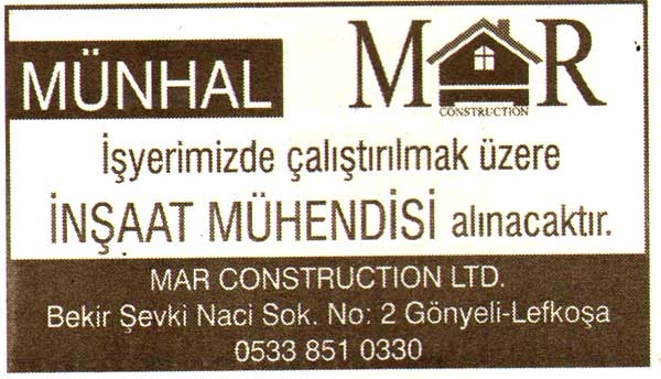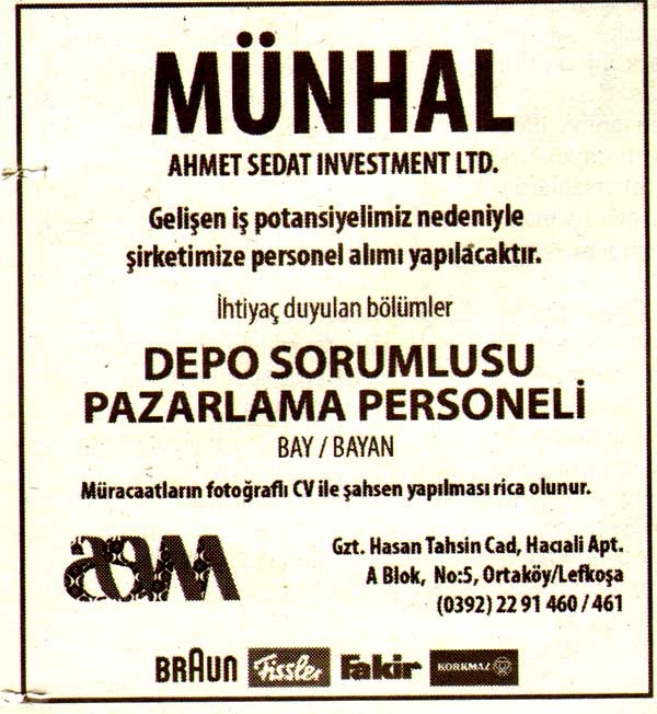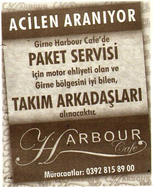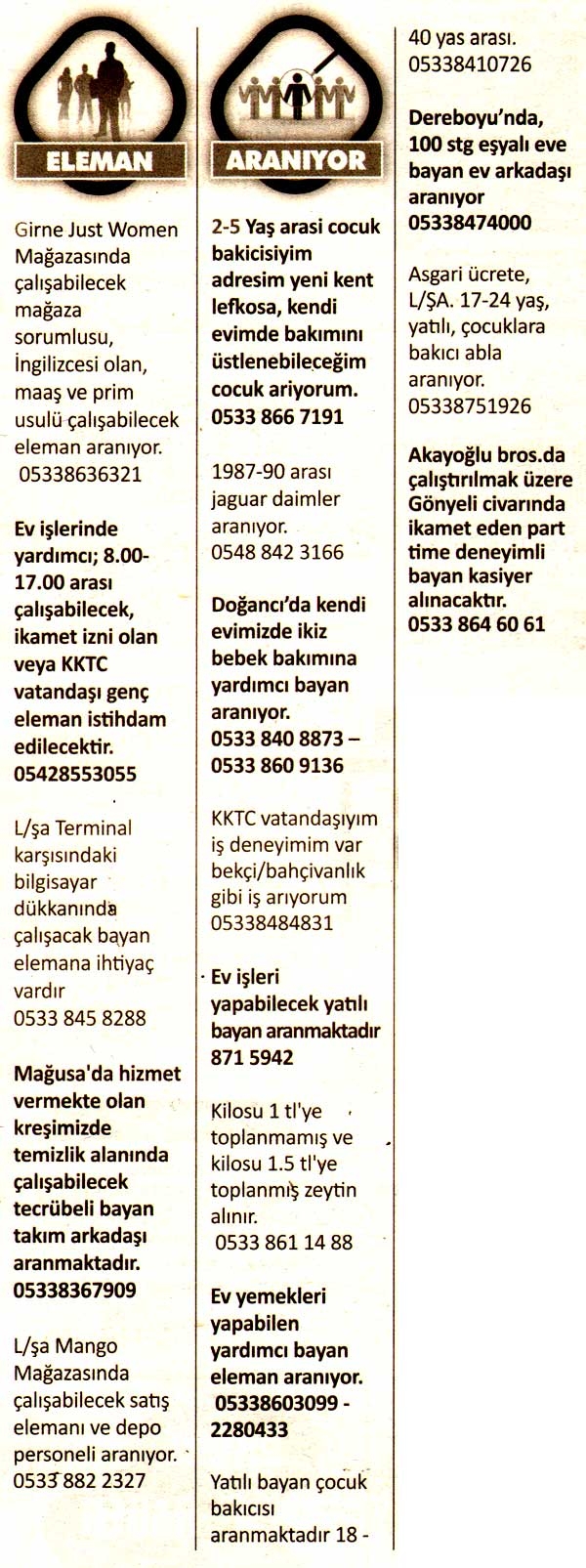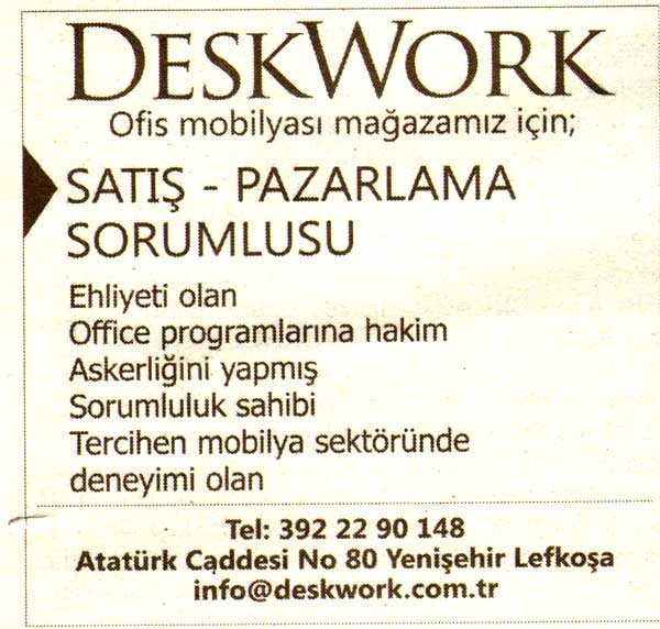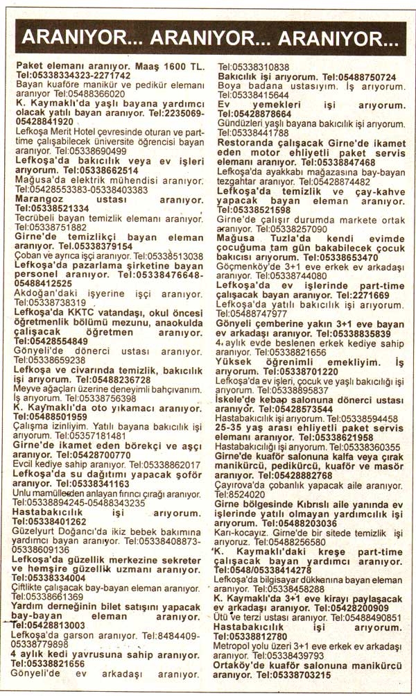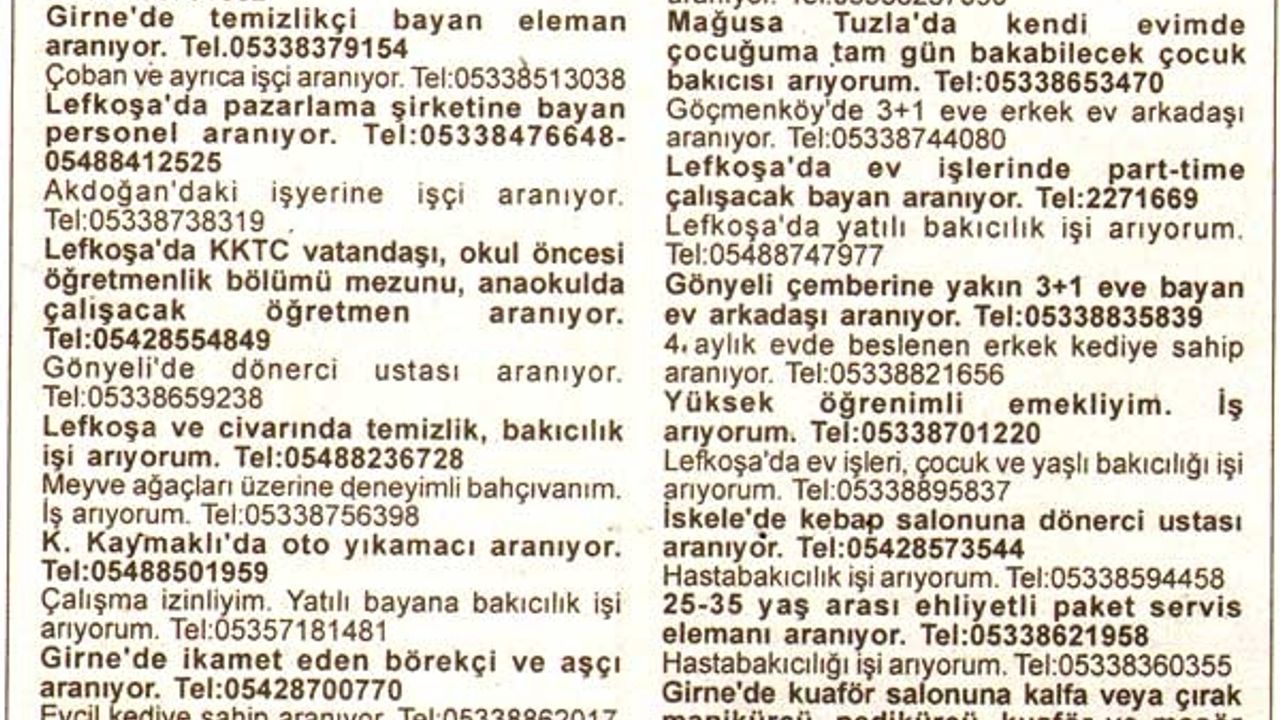 Kıbrıs Gazetelerinde yer alan  iş ilanları. En üstte yer alan "Tam Ekran Yap" tuşuna basarsanız daha büyük halini görebilirsiniz.