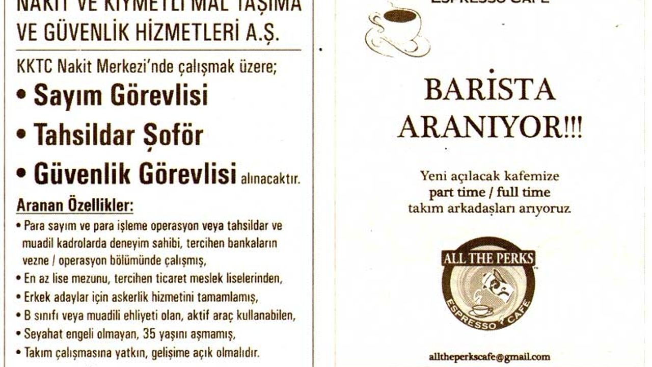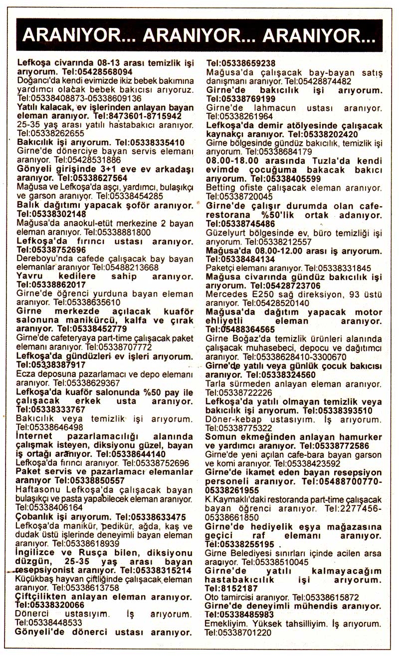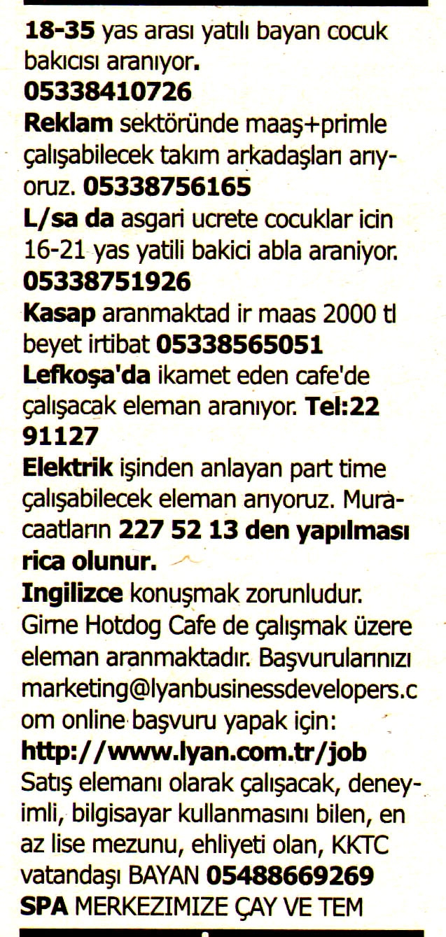 Kıbrıs Gazetelerinde yer alan iş ilanları. En üstte yer alan "Tam Ekran Yap" tuşuna basarsanız daha büyük halini görebilirsiniz.