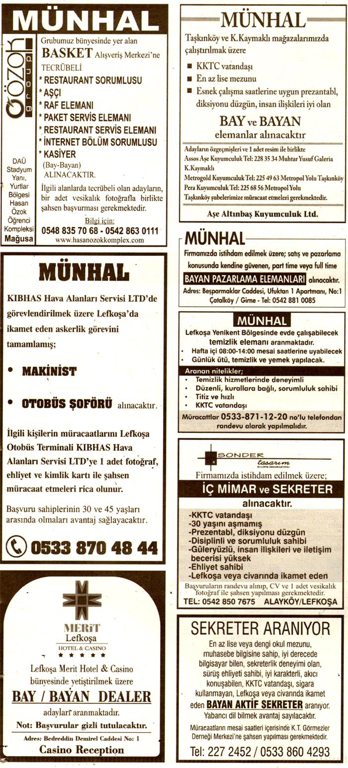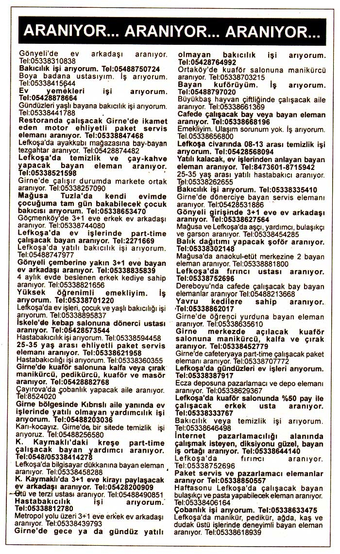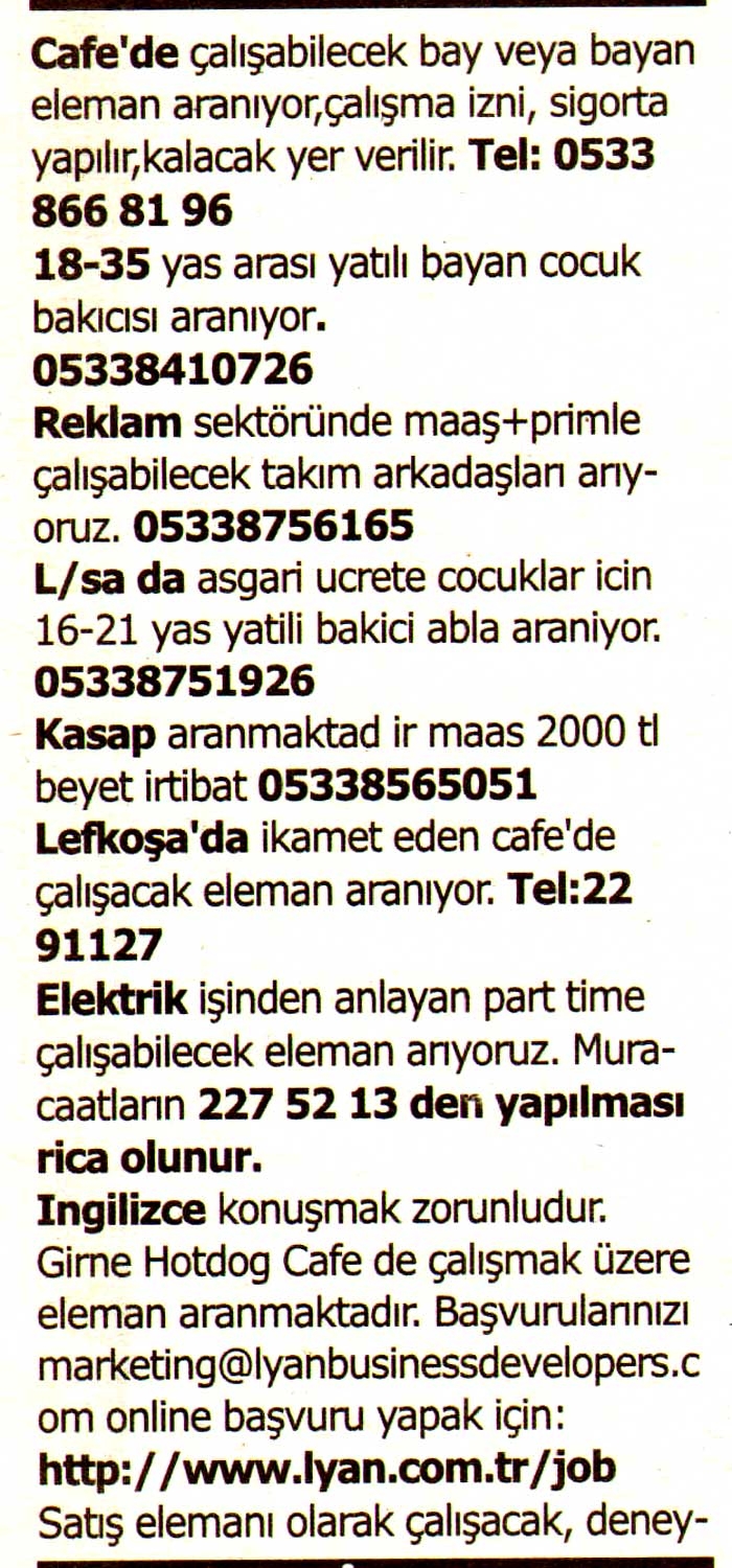 Kıbrıs Gazetelerinde yer alan iş ilanları. En üstte yer alan "Tam Ekran Yap" tuşuna basarsanız daha büyük halini görebilirsiniz.