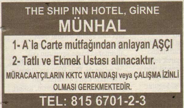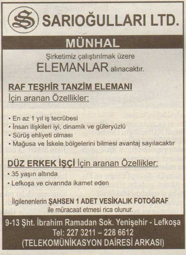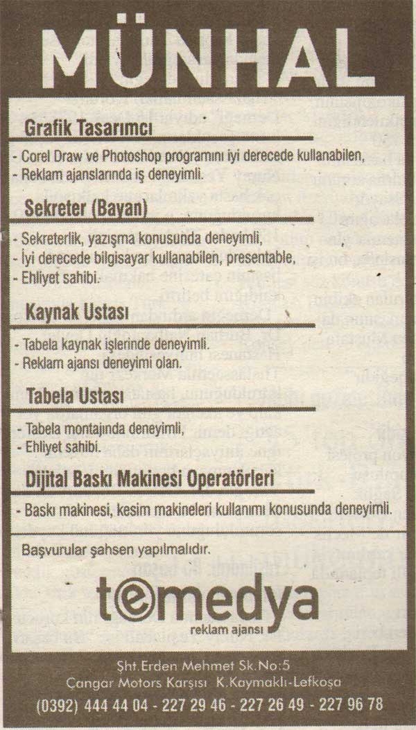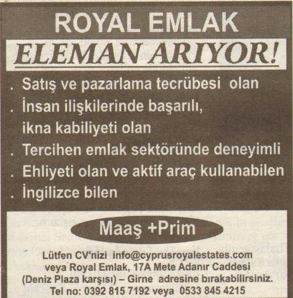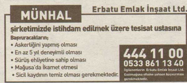 Kıbrıs Gazetelerinde yer alan  iş ilanları. En üstte yer alan "Tam Ekran Yap" tuşuna basarsanız daha büyük halini görebilirsiniz.