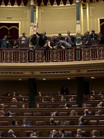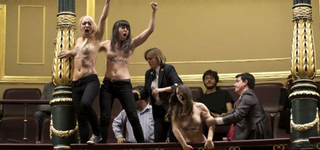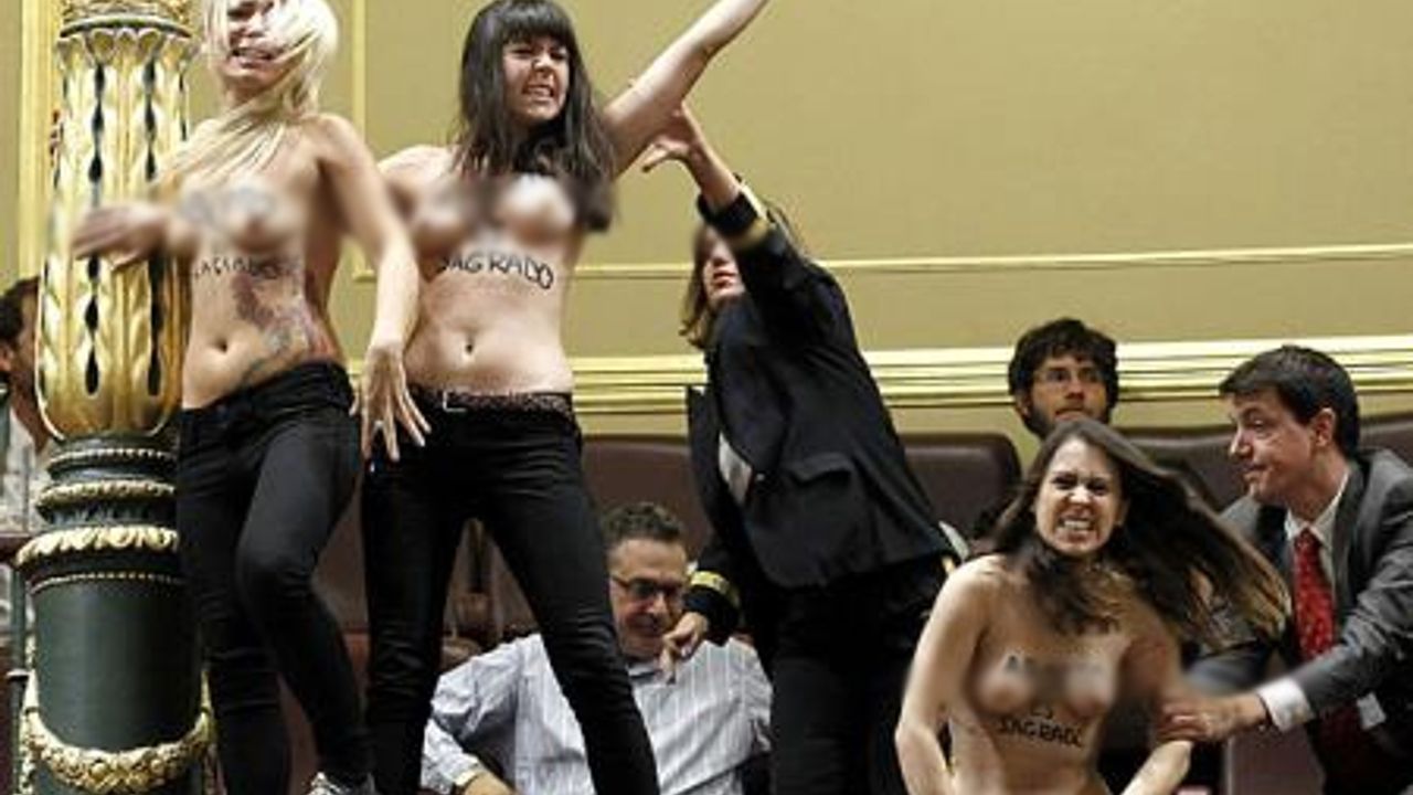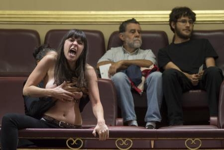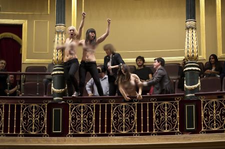 Çıplak eylemcilerden biri meclisin üst balkonundan sarkarak düşme tehlikesi geçirdi. Meclis Başkanı Jesus Posada, bu eylem karşısında soğukkanlılığını koruyarak üstü çıplak kadınların salondan çıkartılmasını istedi.
