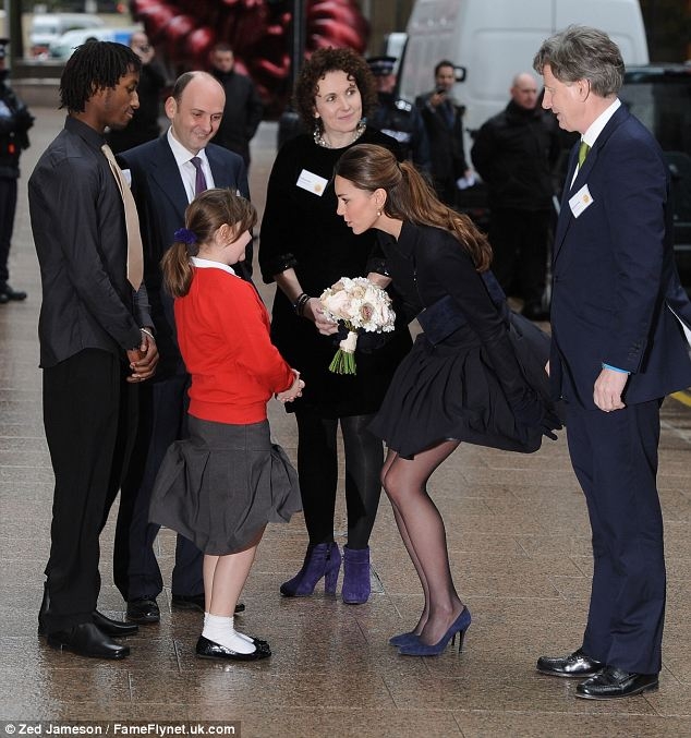 Kendisini karşılayan bir kız çocuğunun sunduğu çiçeği almak için hafifçe eğilen ve onunla sohbet eden Middleton’ın giydiği kısa etek aniden havalandı.