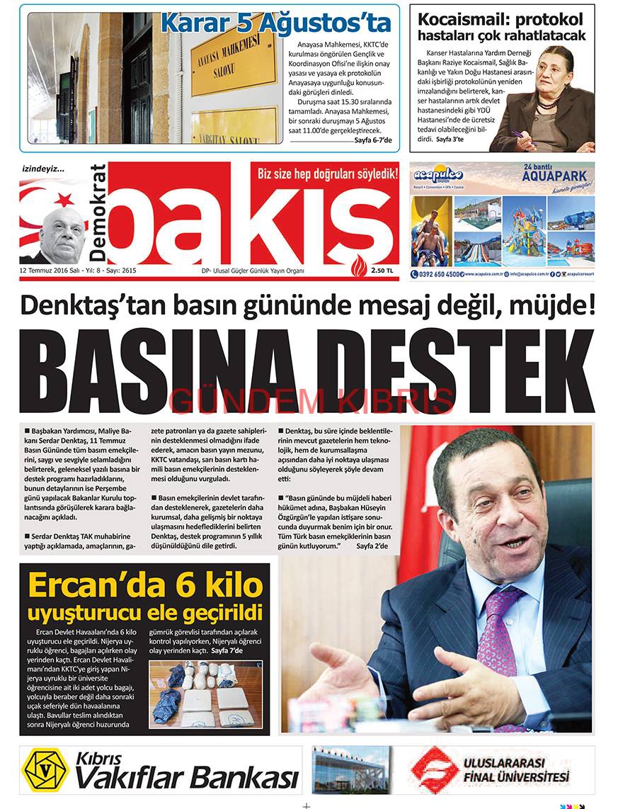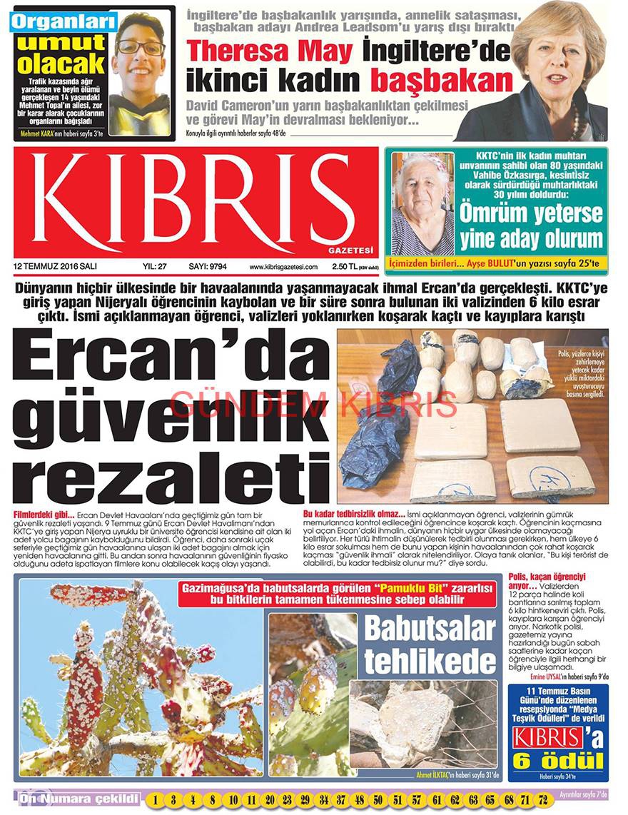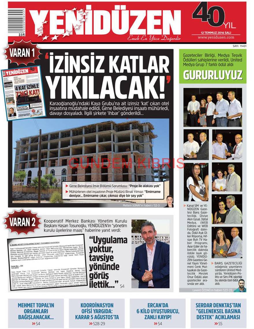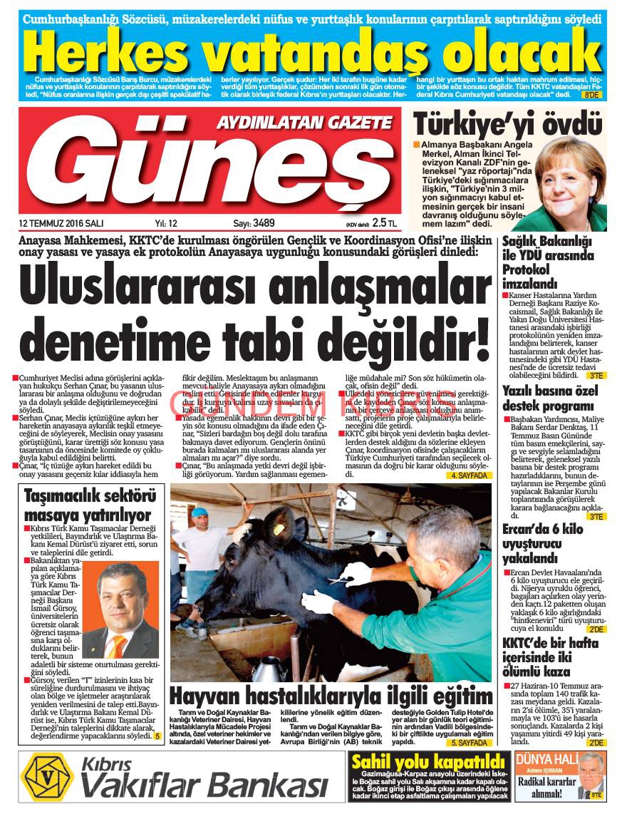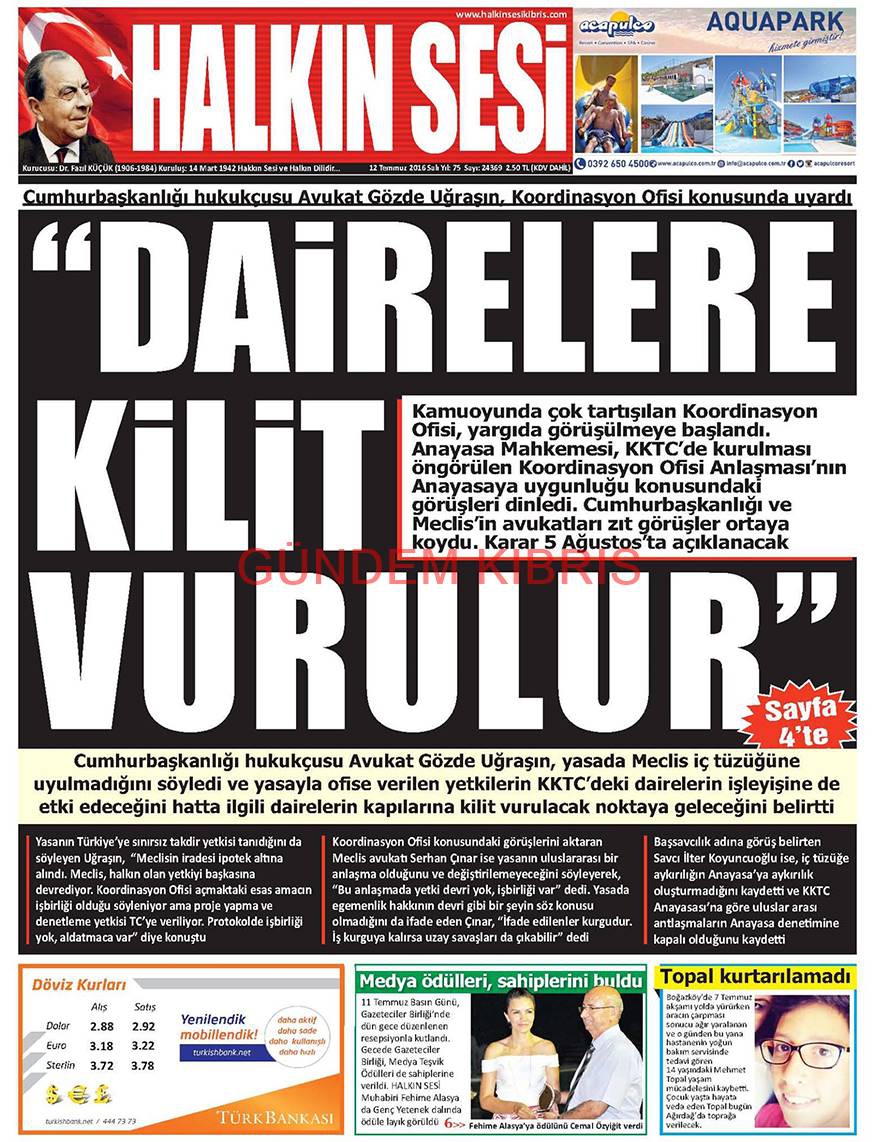 KKTC Gazete Manşetleri 12 Temmuz 2016