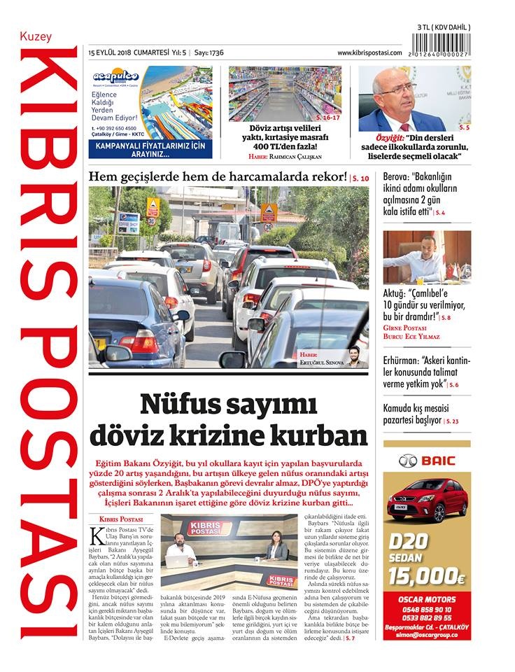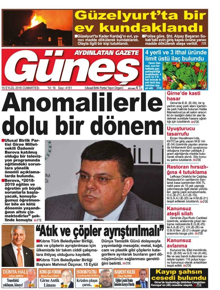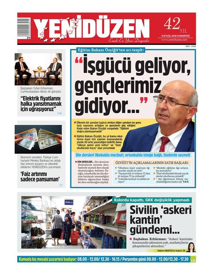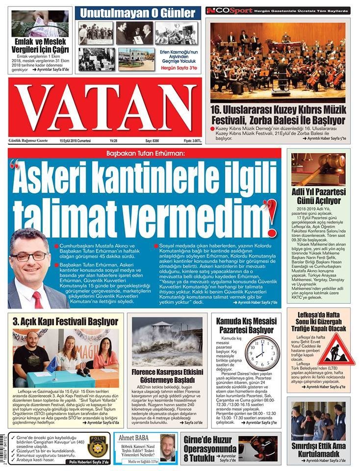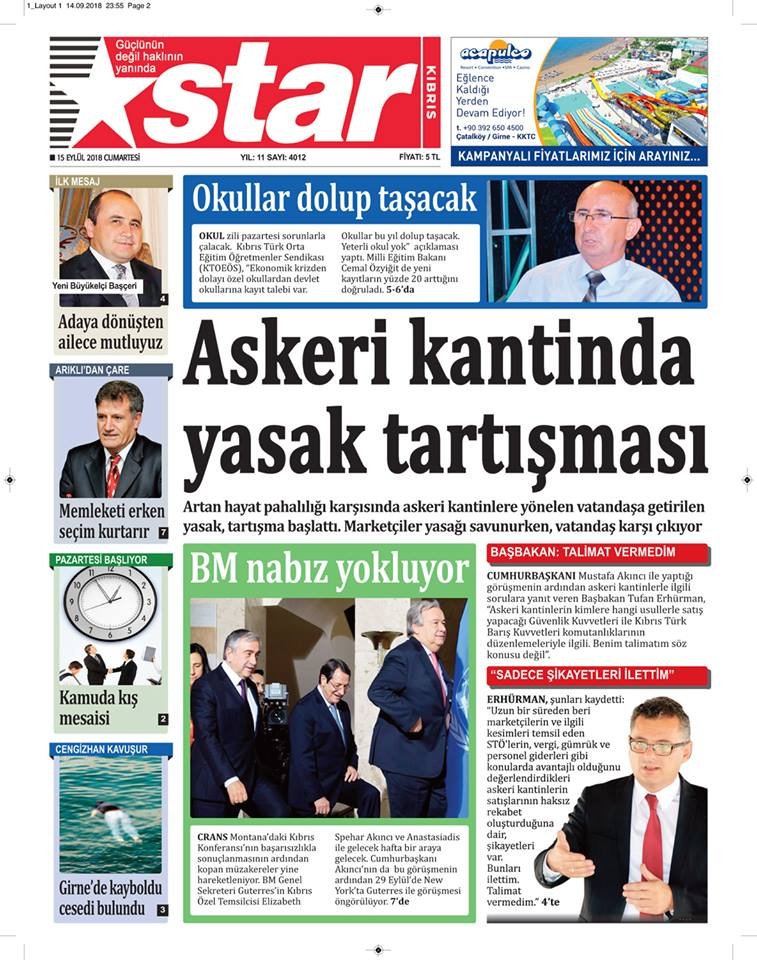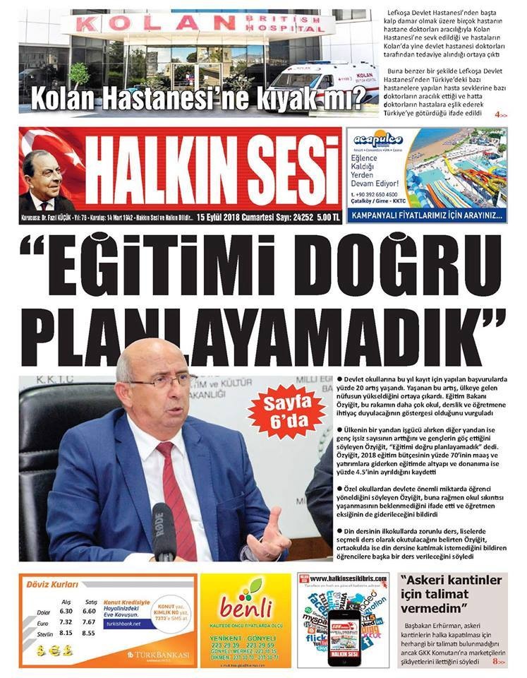 KKTC Gazete Manşetleri 15 Eylül 2018