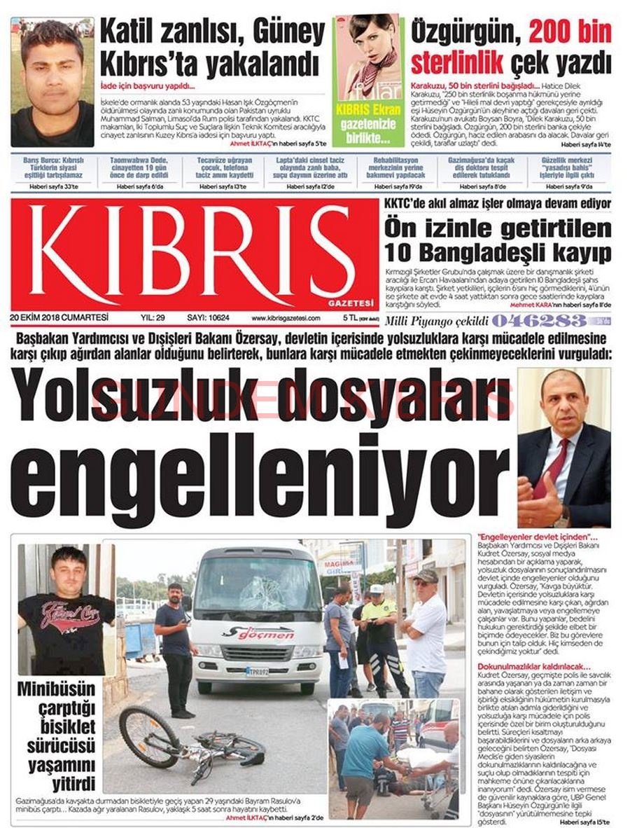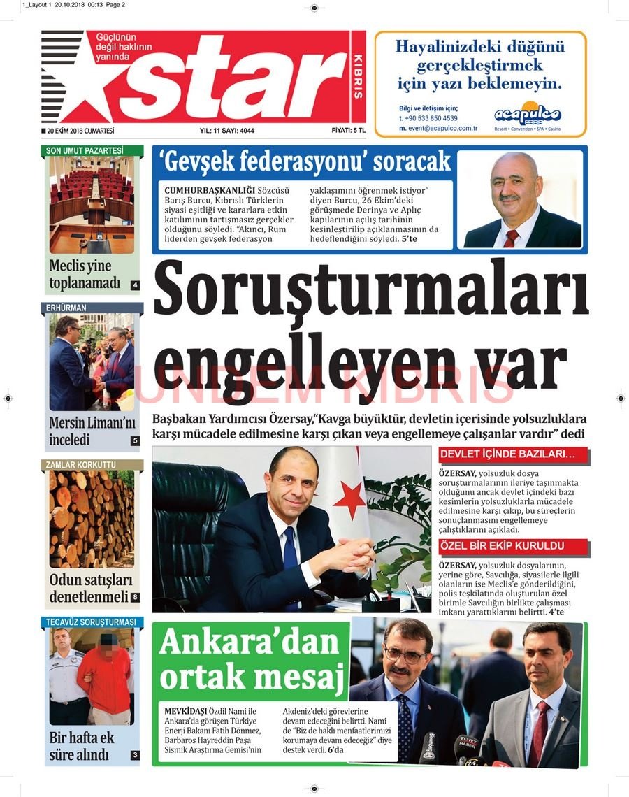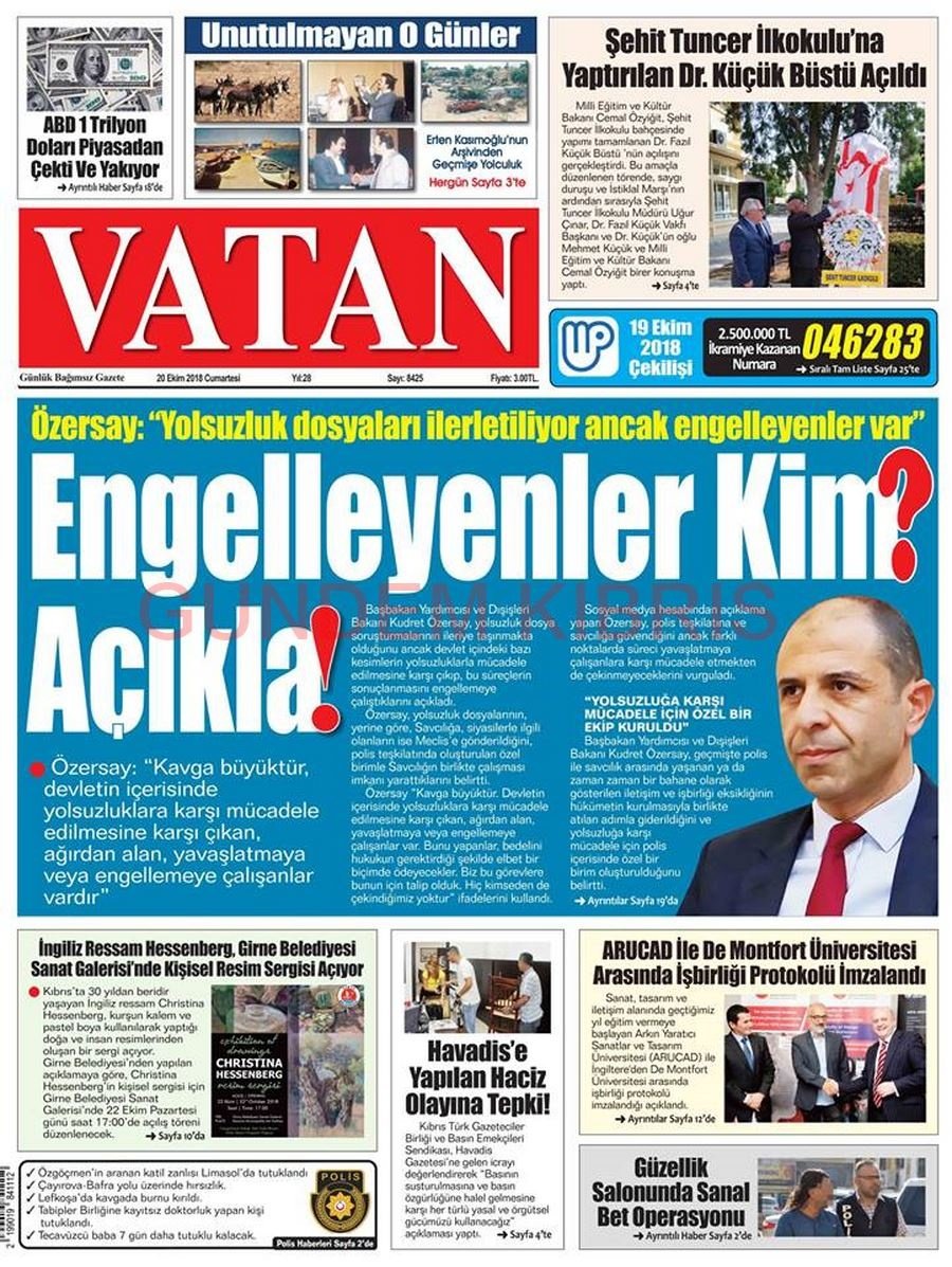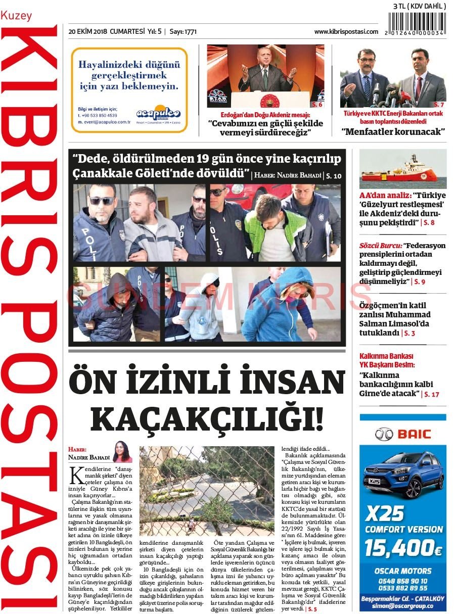KKTC Gazete Manşetleri 20 Ekim 2018