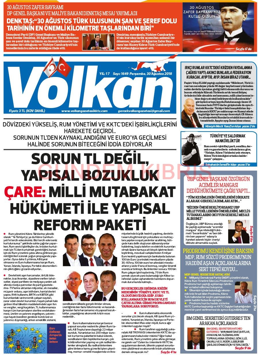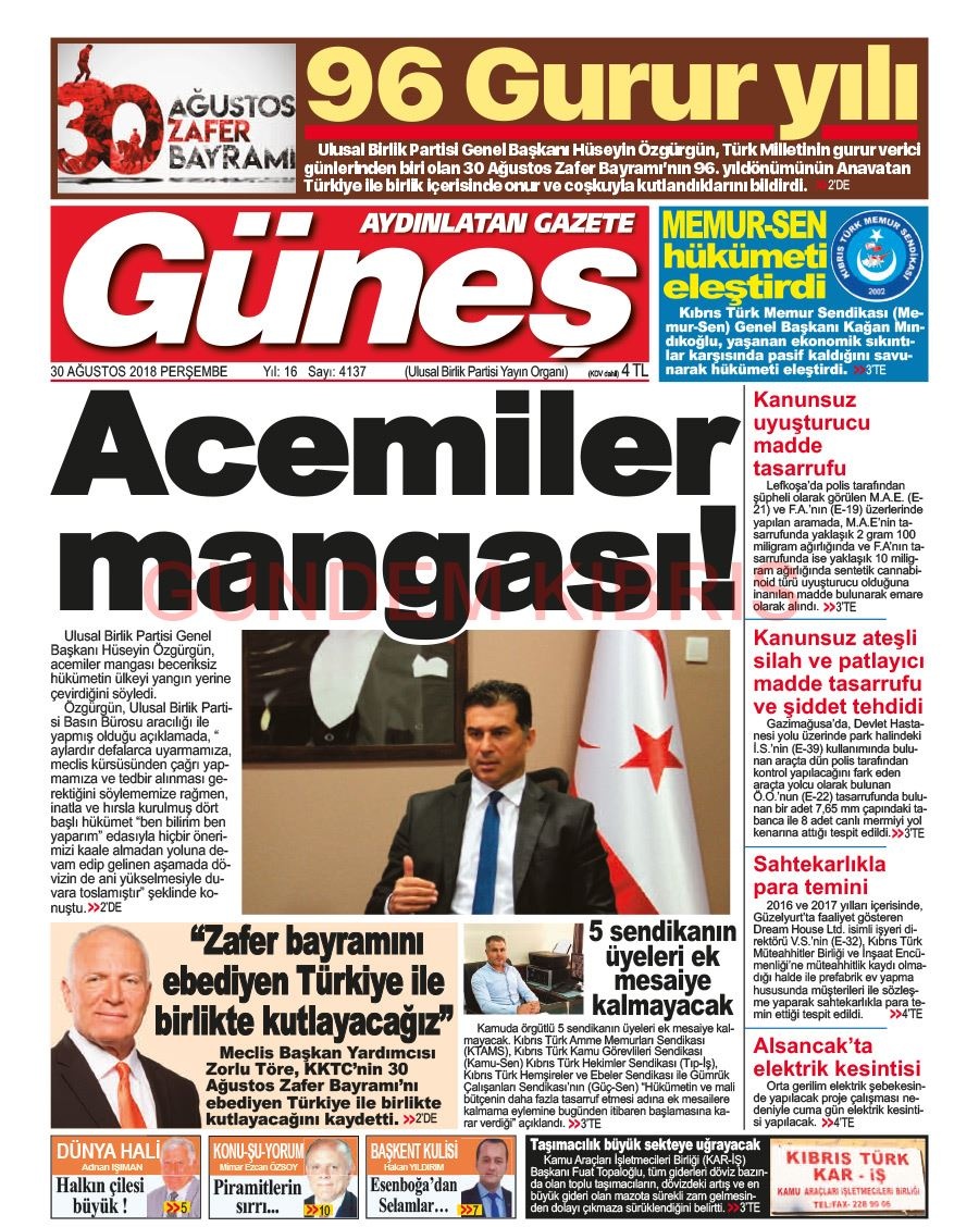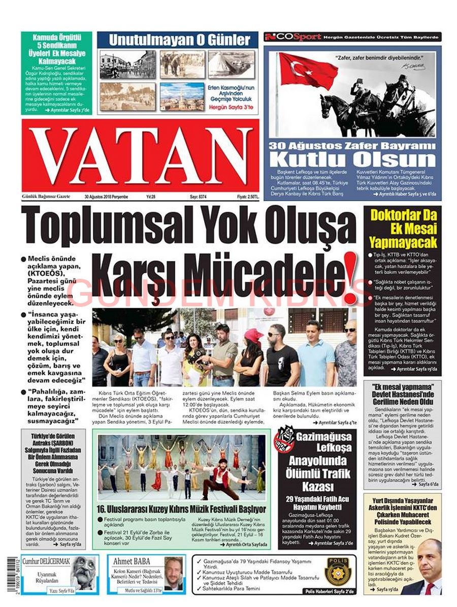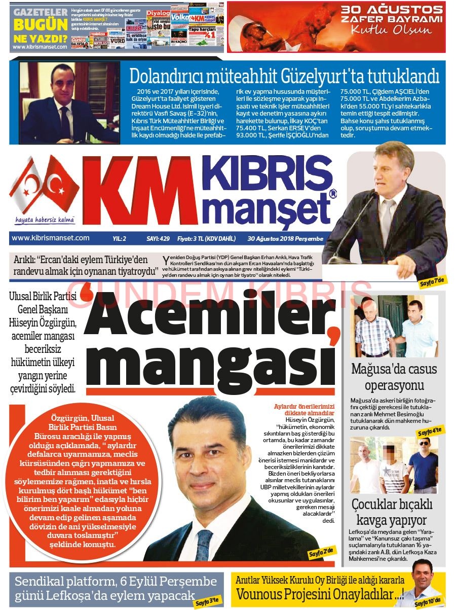 KKTC Gazete Manşetleri 30 Ağustos 2018