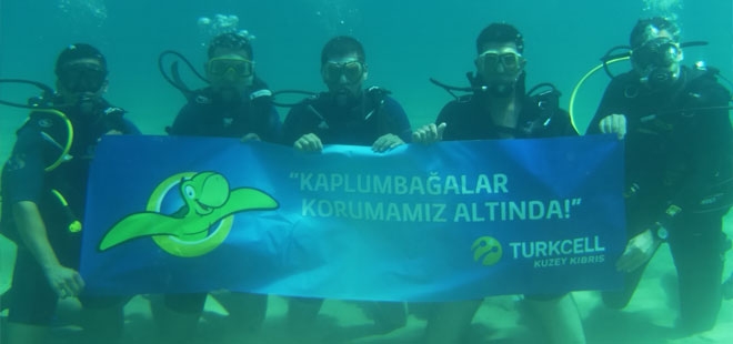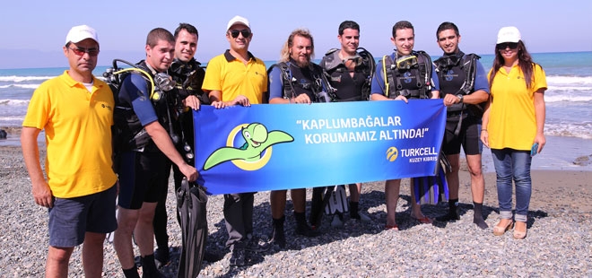 Temizlik sonrasında Kuzey Kıbrıs Turkcell Dalgıç Grubu, Cyprus Dive Shack dalış kulübü eğitmeni Erkan Uyar ile Akdeniz plajına bir dalış gerçekleştirerek, “Kaplumbağalar Korumamız Altında” pankartını açtı.