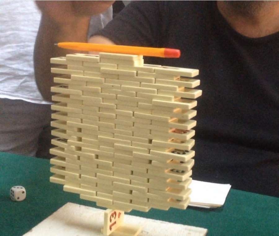 Küçük bir inatlaşma ardından gazozuna girilen iddia üzerine Ayyıldız tam 106 okey taşını tek bir taşın üzerinde dengede kalacak şekilde dizdi.
