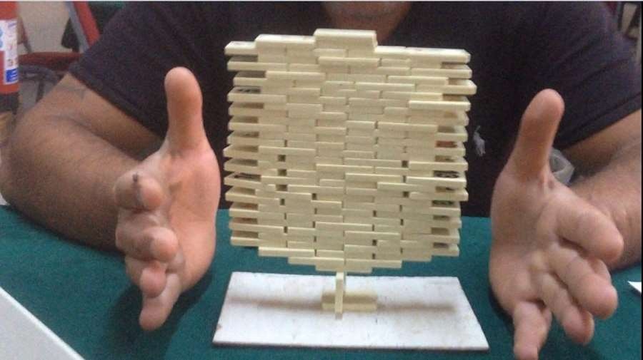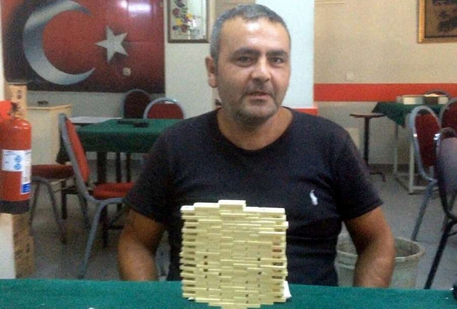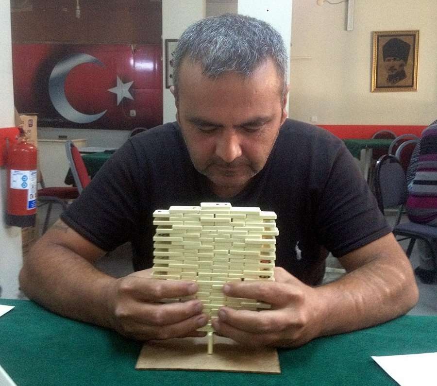 İzmir’in Bayraklı ilçesindeki bir kahvede arkadaşları ile iddiaya giren Hasan Ayyıldız, 106 okey taşını, tek bir taşın üzerinde dengede duracak şekilde dizdi.