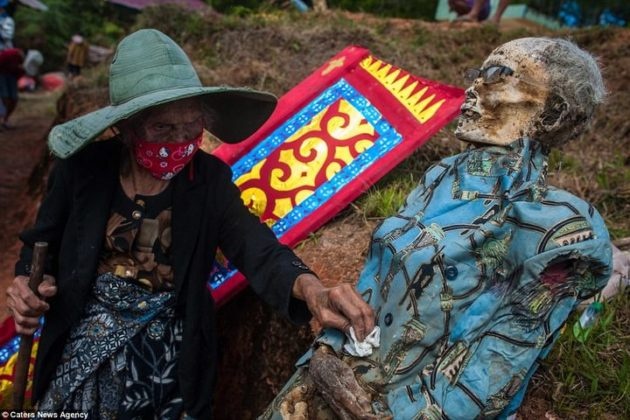 Endonezya, Güney Sulawesi’de yaşayan Toraja halkı, ölen yakınlarını evde tutuyor ve onlara yıllar geçse bile canlı gibi davranıyorlar. 12 yıldır ölü olan bu adam hala evinde tutuluyor.