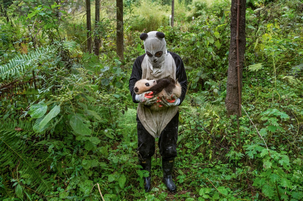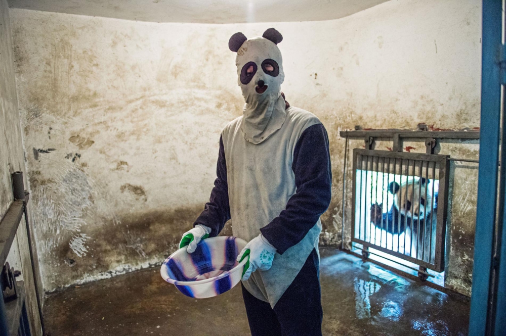 Hetaoping Panda Merkezi’nde yaban hayatındalarmış gibi yetiştirilen pandaların insanları görmeye alışmaması gerekiyor. Üstelik hayvanların kafeslerini temizleyen bakıcılar panda gibi görünmek (ve kokmak) için kostüm giyiyorlar.