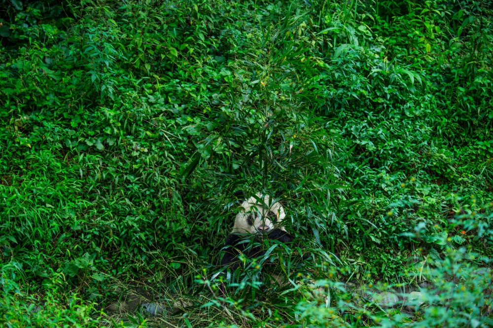 Bifengxia’da bambular arasında kamufle olmuş bir dev panda, gününün çoğunu kendisini çevreleyen ve en sevdiği yiyecek olan bambu yapraklarını çiğnemekle geçiriyor. Pandalar eskiden hem et hem de bitki ile besleniyorlardı. 2 milyon yıl kadar önce ise bambuyla beslenmeye başlamışlar.