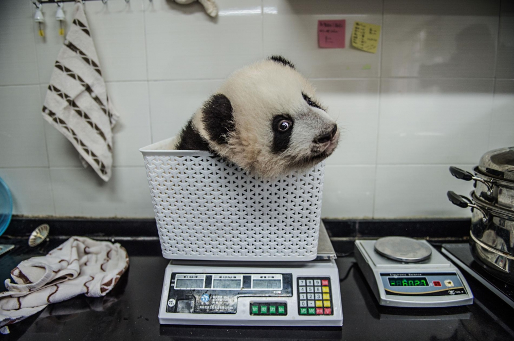 Bifengxia’da bir yavru tartılıyor. Yaban hayatında yetişkinliklerine ulaştıklarında, dişi pandalar 100 kilograma, erkek pandalar ise 115 kilograma kadar ulaşabiliyor ve boyları ise 120 ila 180 santimetreyi bulabiliyor.