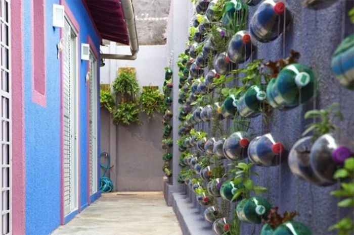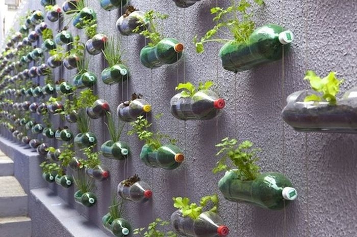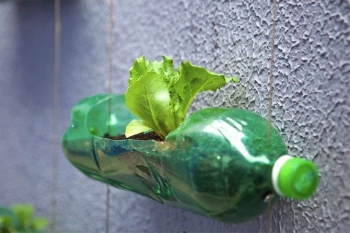 Pet şişeler, yatay olarak kesiliyor. Daha sonra içi toprakla doldurulup, istenilen çiçekler ekiliyor.