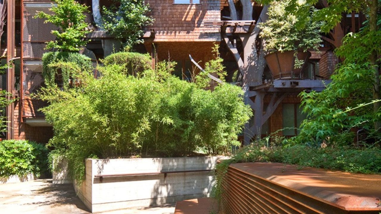 Rastgele aralıklarla bina etrafına yerleştirilen dev saksılardaki ağaçlar, kent sakinlerinin de kıskanarak baktığı bu muhteşem görüntüyü oluşturuyor.