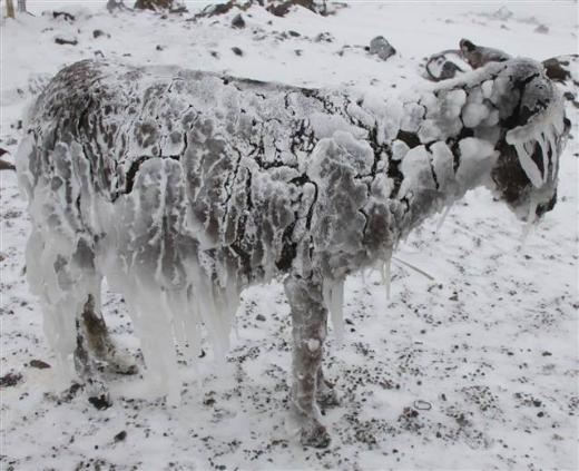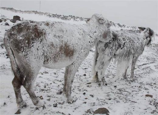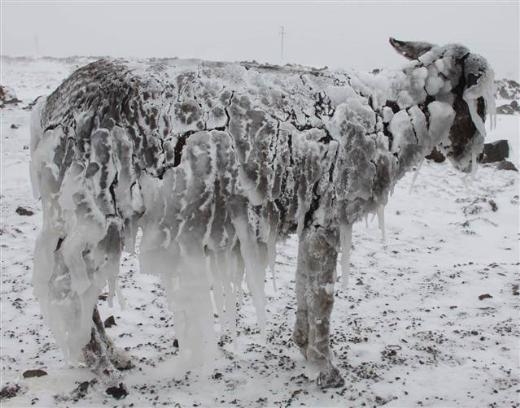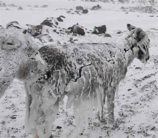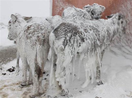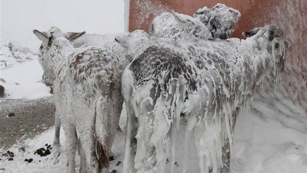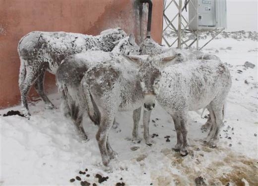 Siverek’e 35 kilometre uzaklıktaki Karlık Köyü’nde, dün geceden itibaren etkisi gösteren soğuk ve kar yağışı nedeniyle tarlalardaki başıboş 5 eşek buz tuttu.