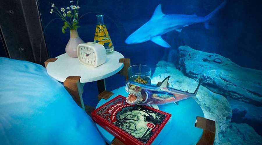 Su altında köpek balıklarıyla uyuyacağınız bir oda