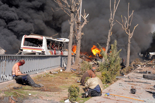 Suriye resmi haber ajansı SANA’nın servis ettiği bir fotoğraf. 21 Şubat 2013’teki o saldırının ardından, yere oturarak şaşkınlığını atmaya çalışan, belki uzuvlarını sayan yaralı Suriyeliler…