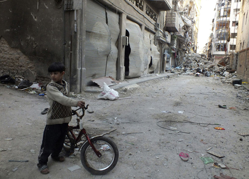25 Mart 2013… Humus… Bir erkek çocuğu hasarlı binaların arasında bisikletiyle oynama telaşında.