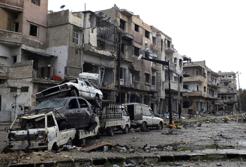 19 Şubat 2013’te, Humus’un Halidiye meydanından alınmış bir görüntü... Üst üste konan hasarlı otomobiller bir tür ‘siper’ haline getirilmiş…