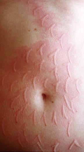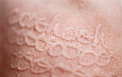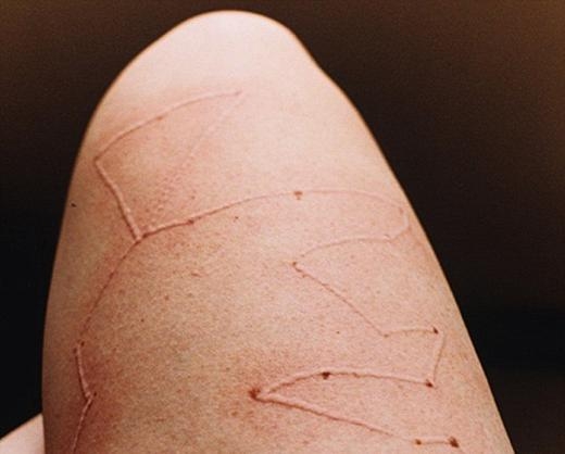Dokunduğu her yeri anında kızarıp, kabaran Russel bedenini bir tuval olarak kullanıyor ve fotoğraflarını çekip sergiliyor.