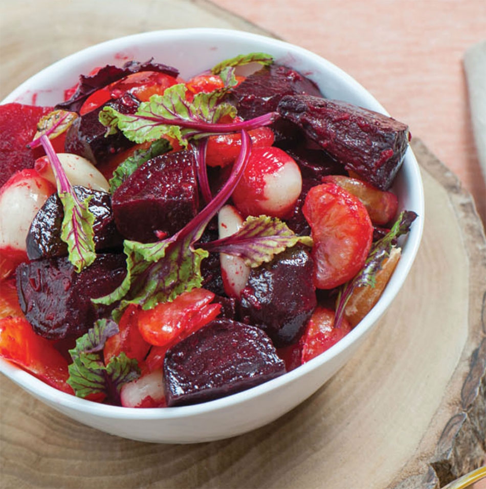 2 Kalan pancarları 30 dakika daha pişirin. Pancarlar da piştikten sonra bütün sebzeleri bir servis tabağına alın. Mandalinaları da soyup bütün olarak dilimleyip sebzelerin üzerine ekleyin. Hazırladığınız sosu gezdirip salatanızı karıştırın. Bütün pancar yapraklarıyla süsleyerek servis yapın.