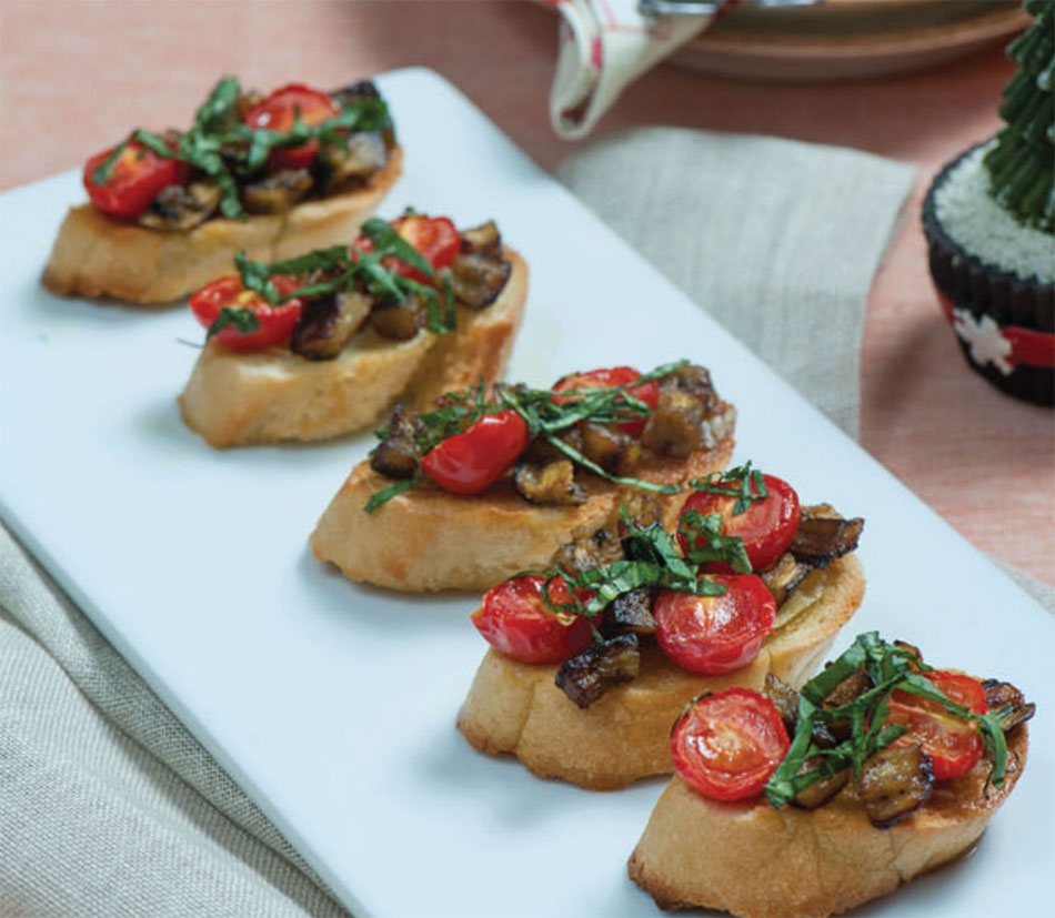 2 Arnavut biberini zeytinyağının içinden çıkartın. Sarımsaklı zeytinyağını kızarmış baget ekmeklerinin üzerine sürün. Fırından çıkan patlıcanları ve çeri domatesleri ekmeklerin üzerine yayın. İnci kıyılmış fesleğen yapraklarıyla süsleyerek servis yapın.