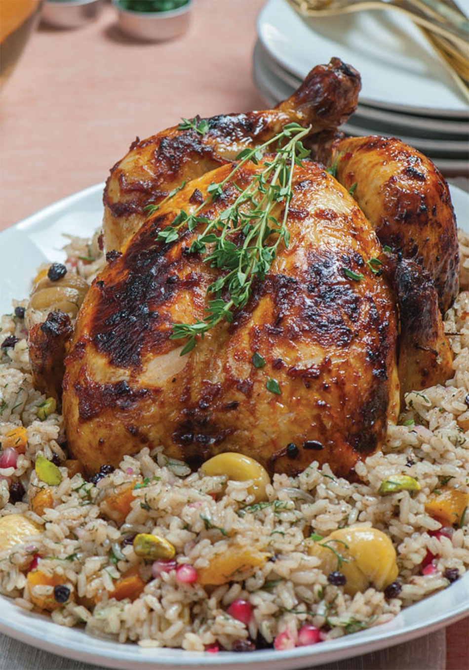 2 Dinlenen tavuğu bir fırın kabına alın. Önceden ısıtılmış 180 derece fırında 1 saat pişirin. Pişirirken fazla kararmaması için tavuğun üzerini yağlı kağıt ile kapatın. Her tarafı iyice kızardıktan sonra fırından alın. Bir servis tabağına yerleştirin ve yanında narlı, kestaneli pilav ile servis yapın