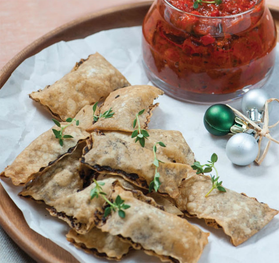 2 Yemeklik doğradığınız soğan ve ezdiğiniz sarımsağı zeytinyağında pembeleşinceye kadar kavurun. Salçaları ekleyip 2-3 dakika daha kavurun. İnce doğradığınız kırmızı kapya biberi, küp doğradığınız domatesi ilave edip domates suyunu çekinceye kadar pişirin. Tuz ve baharatlar ile tatlandırın. Ocaktan alıp soğumaya bırakın. Zeytin ezmeli çıtırları dip sos ile birlikte servis yapın.