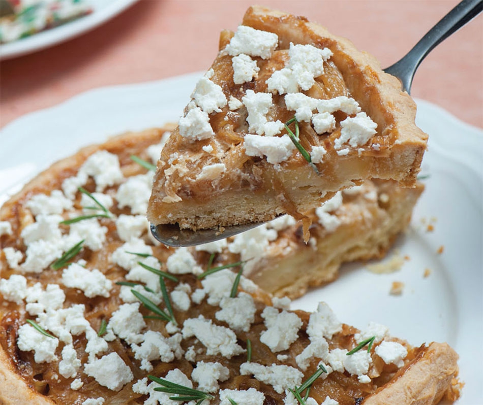 3 Patatesleri ince yuvarlak dilimleyin. Yapışmaz yüzeyli bir tavada hafif kızartın. Ocaktan alıp soğumaya bırakın. Dinlenen hamuru tart kalıbınızın boyutunda açıp içine bastırarak yerleştirin. Tabanına çatalla delikler açıp ılınan patateslerden yerleştirin. Soğanlı harcı patateslerin üzerlerine paylaştırın. Önceden ısıtılmış 180 derece fırında hamur kızarana kadar yaklaşık 35-40 dakika pişirin. Üzerini taze biberiye yaprakları ve lor peyniri ile süsleyerek servis yapın.