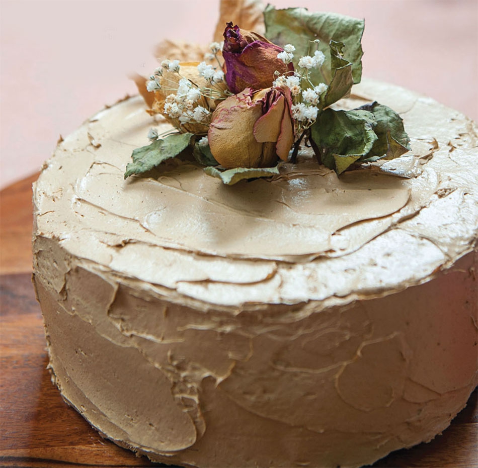 3 Üzeri için granül kahveyi sütte eritin. Toz krem şantiyi ilave edip katılaşıncaya kadar bir mikser yardımıyla çırpın. Krema kıvam aldığında bir spatula yardımı ile ılınan kekinizin üzerine sürün. Üzerini kurutulmuş çiçek ve yapraklarla süsleyerek servis yapın.