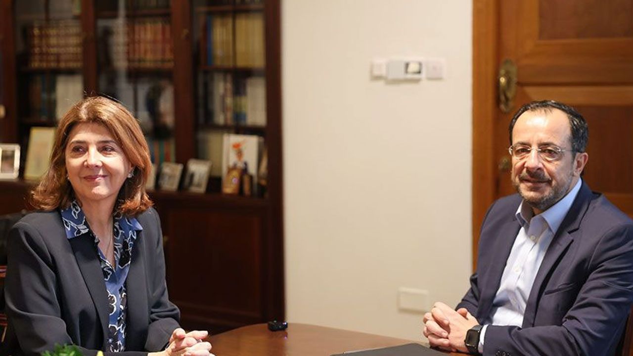 Birleşmiş Milletler (BM) Genel Sekreterinin Kıbrıs Kişisel Temsilcisi Maria Angela Holguin Cuellar ile Rum Yönetimi Başkanı Nikos Hristodulidis bu sabah Rum Başkanlık Sarayında bir araya geldi.