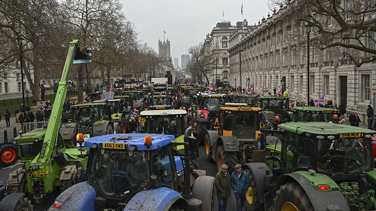 Çevresinde ve üzerinde Başbakanlık, bakanlıklar ve parlamentonun yer aldığı Whitehall Caddesi'ni trafiğe kapatan çiftçiler, buraya çıkan yollarda da traktörlerle konvoylar oluşturdu.
