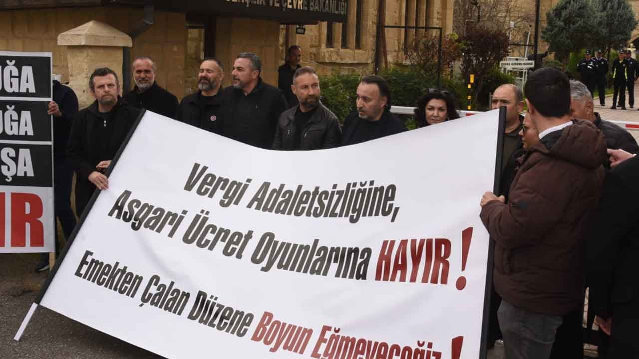 Lefkoşa Terminal Çemberi’nde toplanan Kıbrıs Türk Amme Memurları Sendikası (KTAMS), Kıbrıs Türk Kamu Görevlileri Sendikası (KAMUSEN), Kamu İşçileri Sendikası (KAMU-İŞ), Kıbrıs Türk Öğretmenler Sendikası (KTÖS) ve Kıbrıs Türk Orta Eğitim Öğretmenler Sendikası (KTOEÖS) yetkilileri, sloganlarla Başbakan Yardımcılığı, Turizm, Kültür, Gençlik ve Çevre Bakanlığı önüne yürüdü.
