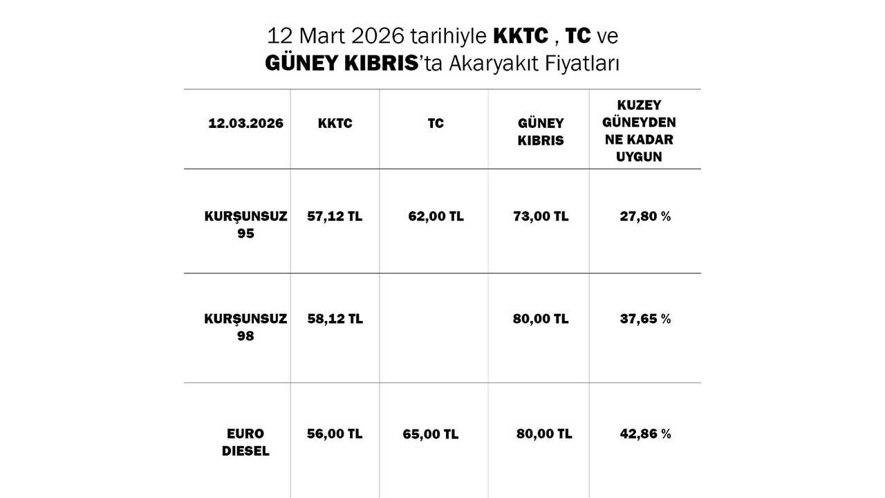 Euro dizelde ise fark daha da artıyor. KKTC’de litre fiyatı 56 TL olan euro dizel, Türkiye’de 65 TL, Güney Kıbrıs’ta ise 80 TL civarında satılıyor. Buna göre Kuzey Kıbrıs’taki euro dizel fiyatı Güney’e göre yüzde 42,86 daha düşük.