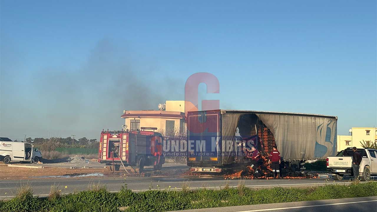 Polis açıklamasına göre, 15 Şubat 2026 tarihinde saat 16.00 sıralarında, İnönü ile Dörtyol kavşakları arasında Gazimağusa istikametine doğru ilerleyen tırın dorsesinde, lastiğin patlaması sonucu yangın meydana geldi.