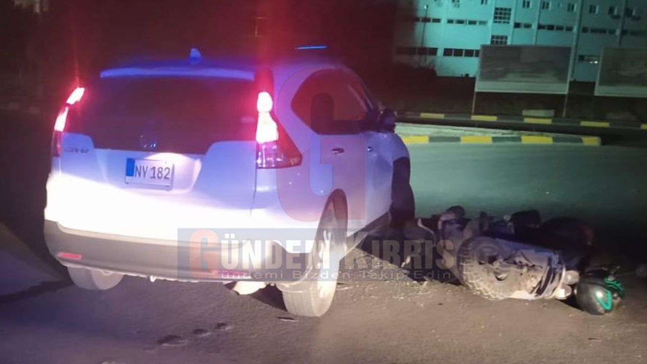 Lefkoşa'da bugün saat 03:40’ta Özker Özgür Caddesi üzerinde NY 182 plakalı aracı batı istikametine doğru kullanan 22 yaşındaki Kayra Besim, yol üzerinde bulunan çembere geldiği zaman Çember içerisindeki araçlara öncelik hakkı vermeden dikkatsiz bir şekilde çembere giriş yaptığı esnada Şht. Mustafa Ahmet Ruso Caddesi boyunca güney istikametine doğru seyreden 23 yaşındaki Şevket Arslan yönetimindeki JS 989 plakalı motosikletin önünü tıkaması sonucu çarpıştılar. Meydana gelen kaza sonucu yaralanan JS 989 plakalı motosiklet sürücüsü Şevket Arslan kaza mahalline gelen 112 acil servis ambulansı ile Lefkoşa Devlet Hastanesine kaldırılarak beyin kanaması teşhisi ile Cerrahi Genel Yoğun Bakım Servisinde müşahede altına alınmış olup hayati tehlikesi bulunuyor. NY 182 plakalı araç sürücüsü Kayra Besim suçüstü hali gereği tutuklandı. Kaza ile ilgili polis soruşturması sürüyor.