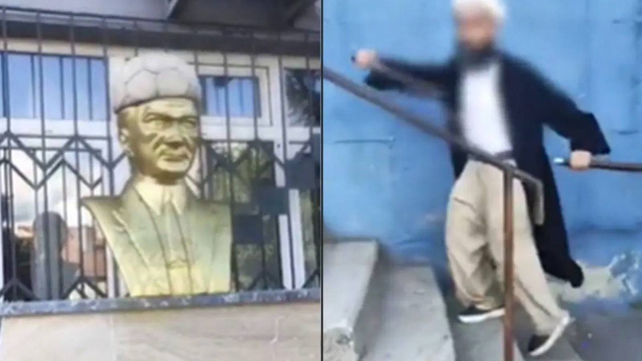 Daha sonra topun bir parçasını okul bahçesinde bulunan Atatürk büstünün üzerine koyan şüpheli, Atatürk’e hakaretler etti.