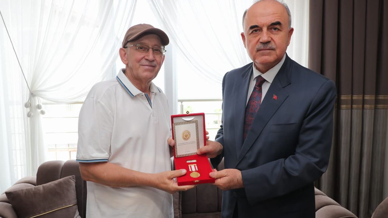 Vali Erol, 71 yaşındaki Sarı'ya madalya ve beratını sundu.